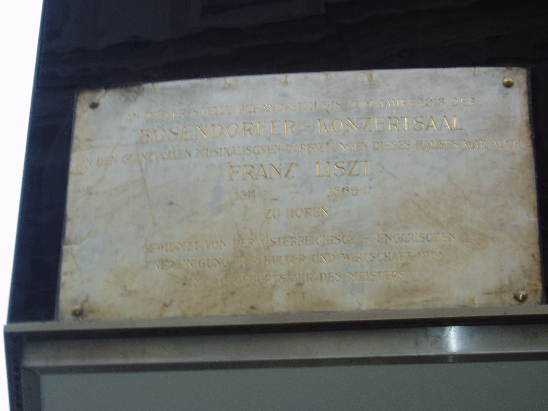 Nyilvános 962 | 1744 | Herrengasse 8. Liszt Ferenc emléktáblája | A mai épület helyén egykor állott házban volt a Bösendorfer zongoragyár koncertterme. Számos jeles muzsikus lépett itt fel, köztük Liszt Ferenc, mint a homlokzaton elhelyezett emléktáblán is olvasható. |