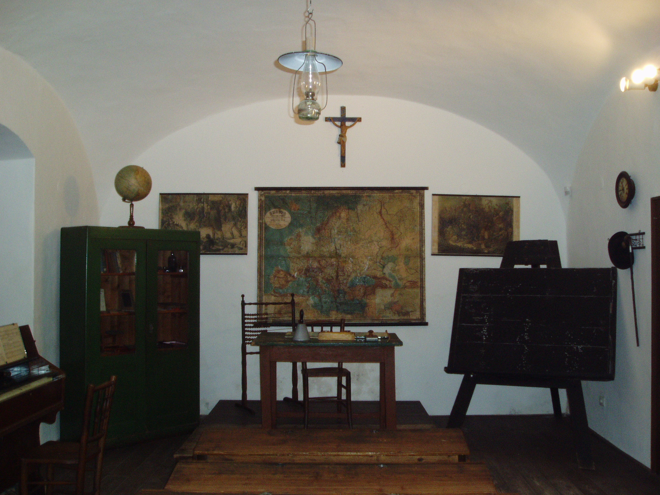 Nyilvános 912 | 1657 | Tapolca: Templom domb 8. Múzeum | A múzeum épülete, az ún. Kántorház - a város védett építészeti emléke - Tapolca történelmi városközpontjában, a Malom-tó fölötti Templom dombon található. Ide járt elemi iskolába a város nagy szülötte, Batsányi János költő. Az épületben 1733-tól 1884-ig folyt az elemi iskolai oktatás. A múzeum iskolatörténeti kiállításának reprezentatív része a régi tanterem.. A maximális életszerűségre való törekvés jegyében a tanteremből szinte csak az iskolamester és a gyerekek hiányoznak. Az ajtótól jobbra fogasra akasztva a tanító úr kalapja és sétapálcája, a katedrán nyitva az 1900-as évek elejéről származó osztálykönyv. A falakon természettudományi, szám- és mennyiségtani szemléltető képek, s magyar történelmi események ábrái a tatárjárástól 1848/49-ig. A tanítói pulpitus mögött nagyméretű Európa-térkép függ, melyet Kogutowicz Manó készített 1893-ban. Az iskolai szekrényekbe bepillantva régi tankönyvek, palatáblák, tintatartók láthatók. Annakidején az ilyen tantermekben általában osztatlan oktatási szisztéma alapján foglalkozott a tanulókkal a tanító, a segédtanító és a pedellus. Az iskolatörténeti kiállítás következő termében tanszer- és szemléltetőeszköz-történeti tárlat tekinthető meg. A felvétel 2007 februárjában készült. Felh. irod.: Látnivalók Veszprém megyében. Miskolc, Well-PRess, 2000 Hangodi László: Múltbanéző - kiállításvezető a Tapolcai Városi Múzeum tárlataihoz. Tapolca, 2006 |