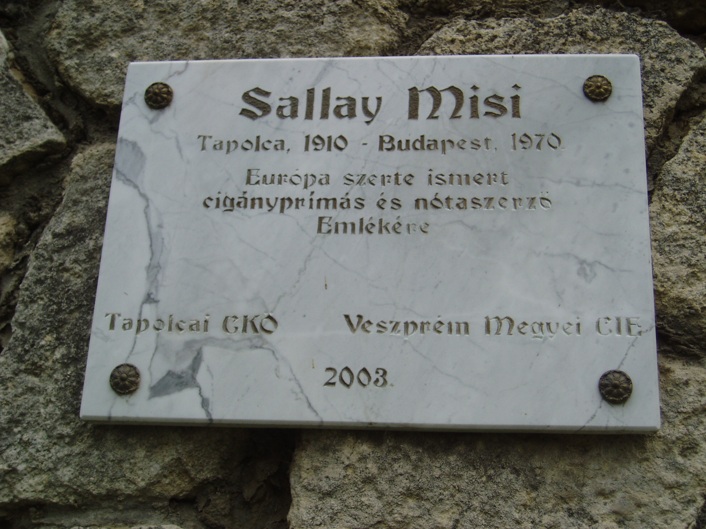Nyilvános 889 | 1824 | Tapolca, Városi Panteonfal: Sallai Misi emléktáblája | A Malom–tó mögött álló magas kőfal a Városi Panteonfal, amelyen több neves, tapolcai kötődésű személyiségnek állítottak emléktáblát. Sallai Misi (1910-1970) Európa-szerte híres cigányprímás Tapolcán született. Emléktábláját 2003-ban avatták fel. (A szakirodalom szerint vezetéknevét i-vel írta, ezen az emléktáblán viszont Sallay alakban szerepel.) A felvétel 2007 februárjában készült. Felh. irod.: Bándi László: Emlékhelyek Veszprém megyében. Veszprém, 1996 www.tapolca.hu |