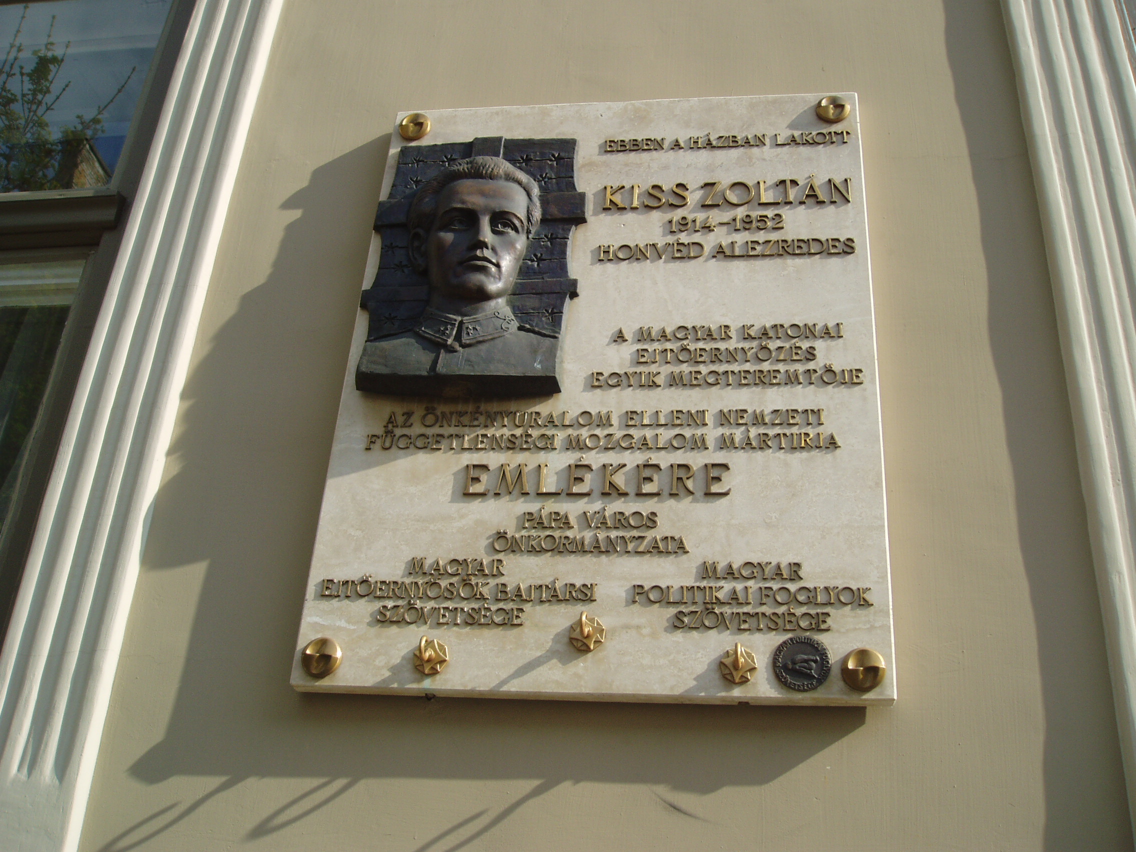 Nyilvános 937 | 1732 | Pápa, Deák Ferenc utca 2. | Ebben a házban lakott Kiss Zoltán (Fadd, 1914. jan. 18. – Bp., 1952. ápr. 11.), a magyar katonai ejtőernyőzés egyik megteremtője. 1938-ban fiatal hadnagyként került a Bertalan Árpád által szervezett ejtőernyős kísérleti keretbe és azzal együtt Pápára. 1941-ben, Bertalan halála után az egység parancsnokává nevezték ki. 1944-ben ezredesként vett részt a második világháborúban. 1945 után a repülőakadémia ejtőernyős kiképzője volt, de 1951-ben letartóztatták, 1952-ben koholt vádak alapján halálra ítélték és kivégezték. A fénykép 2007 áprilisában készült. Felh. irod.: Veszprém megyei életrajzi lexikon. Veszprém, Veszprém Megyei Önkormányzat Közgyűlése, 1998 Veszprém megyei életrajzi lexikon. Veszprém, Veszprém Megyei Önkormányzat Közgyűlése, 1998 |