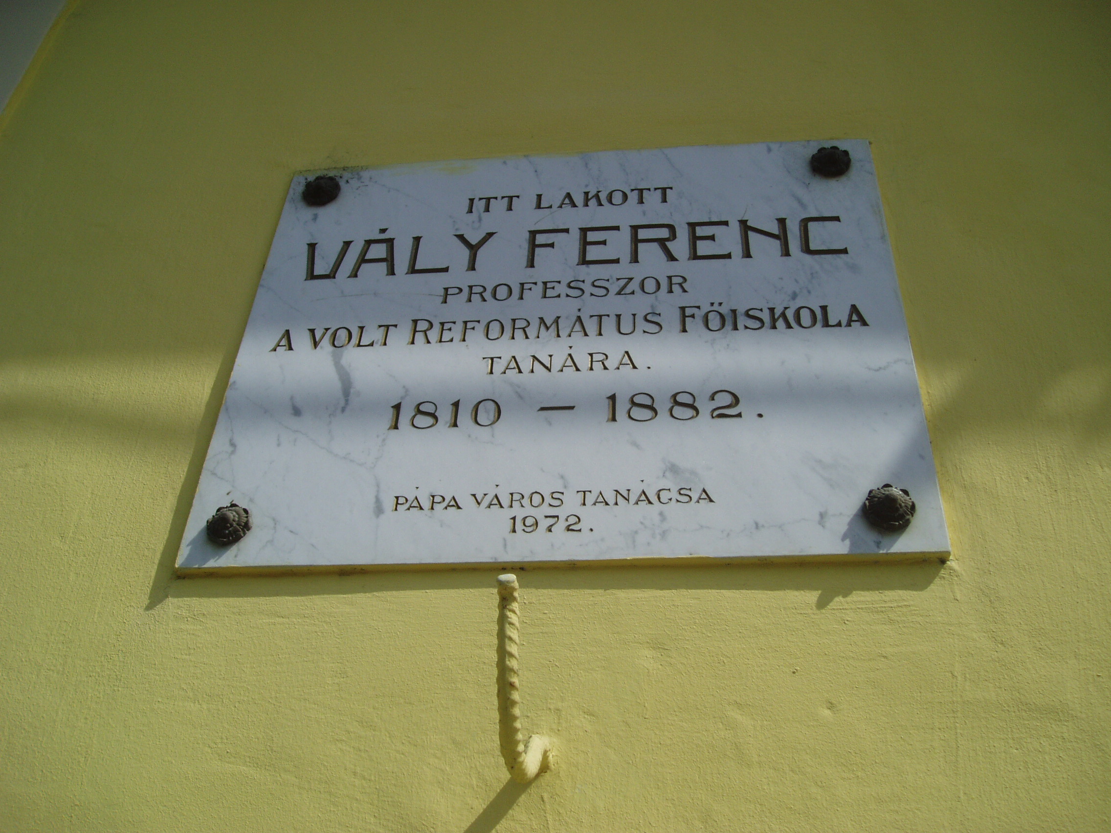 Nyilvános 912 | 1494 | Pápa, Jókai utca 20. | Ez a kis ház volt Vály Ferenc főiskolai professzor lakóháza pápai évei alatt. Vály Ferenc (Magyarsiófok, 1810. szept. 30. – Pápa, 1882. dec. 13.) tanár, tankönyvíró. 1833-tól néhány évig tanító volt Pápán, de visszakerült Komáromba, ahol 1839-től a református gimnázium igazgatójaként működött. 1839-ben feleségül vette Jókay Esztert, Jókai Mór nővérét. A szabadságharc után, melyben tüzérként vett részt, telepedett le a család Pápán, ahol a református főiskola tanára és a tanítóképző igazgatója volt. Egy természetrajzi és egy kémiai tankönyve jelent meg. 1882-ben hunyt el, a pápai Alsóvárosi temetőben nyugszik (lásd: Pápa, Alsóvárosi temető: Vály Ferenc sírja). Felesége, Jókay Eszter 1816-ban született Komáromban. Számos cikket és visszaemlékezést írt a korabeli folyóiratokba, többek között forrásértékű adatokkal szolgált Jókai Mór gyermekkoráról. 1889. máj. 7-én hunyt el Pápán, férjével közös sírban nyugszik. Leányuk, az ebben a házban (is) nevelkedett Vály Mari Komáromban született 1840. nov. 17.-én. Férjének és gyermekének korai halála után Jókaiékhoz költözött a fővárosba, háztartásuk vezetésében segédkezett. Nagybátyja életét terjedelmes emlékiratban örökítette meg. Pápán hunyt el 1915. május 17-én, sírja szülei nyughelye mellett van (lásd: Pápa, Alsóvárosi temető: Vály Mari sírja). A fénykép 2007 áprilisában készült. Felh. irod.: Németh Adél - Szabó Lajos: Pápa. Bp. Panoráma, 1989 Veszprém megyei életrajzi lexikon. Veszprém, Veszprém Megyei Önkormányzat Közgyűlése, 1998 |