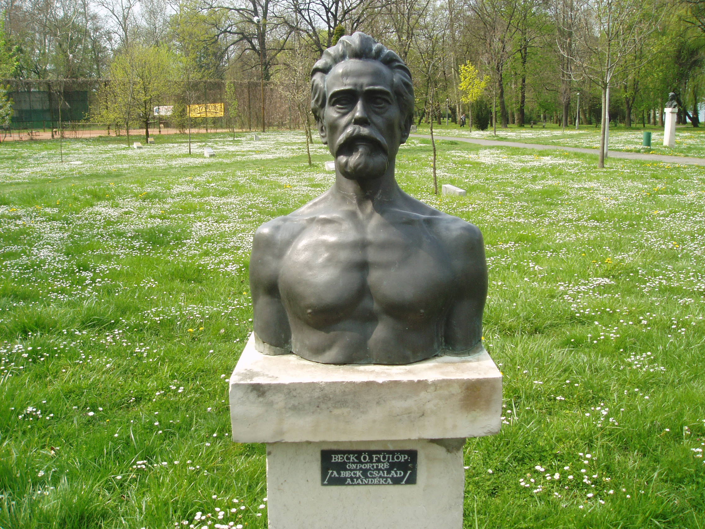 Nyilvános 939 | 2378 | Pápa, Köztársaság liget 1. Beck Ö. Fülöp szobra | Az 1970-es években felépített, Jókai Mórról elnevezett Városi Színház parkjában Pápához kötődő jeles személyiségek mellszobrait állították fel, köztük az 1873-ban Pápán született Beck Ö. Fülöp önportréját, amelyet a Beck család adományozott a városnak. A fénykép 2007 áprilisában készült. |