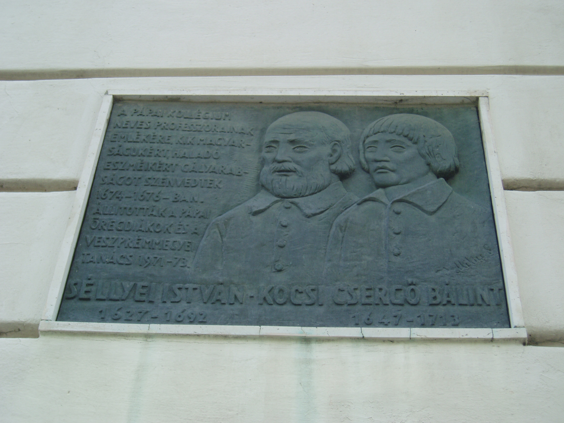 Nyilvános 866 | 1524 | Pápa, Március 15. tér 9. Pápai Református Kollégium Gimnáziuma | A híres pápai Református Kollégium első épülete 1531 és 1752 között a mai Ruszek közben, a Lábasház épületének helyén állott. 1752-ben - Mária Terézia rendeletének következtében, amely megszüntette a szabad vallásgyakorlást - harminckét évig csak a közeli Adásztevelen működhetett. 1784-ben, II. József türelmi rendeletének köszönhetően térhetett vissza az iskola Pápára, s hamarosan felépült a ma Ókollégiumként ismert épület (lásd: Pápa, Petőfi u. 13.), amelyben 1794-ben indulhatott meg az oktatás. Az intézmény 1857-ig működött ott, ekkor átköltözött a Március 15. tér 13-15. számú házba, az ún. Nátus-ba, majd 1895-ben utolsó végleles helyére, ide, a Március 15. tér 9. számú monumentális új épületbe. A képen látható dombormű Séllyei István (1669-1692) gályarab prédikátor, dunántúli püspök, valamint Kocsi Csergő Bálint (1647-1711), szintén gályarabságra ítélt író, lelkész, tanár emlékét őrzi. Miután Ruyter holland tengernagy segítségével (lásd még: Debrecen, Emlékkert: Gálayarabok emlékoszlopa) kiszabadultak még életben lévő társaikkal együtt, hazatérve fellendítették az iskolát. Az emléktábla Mikus Sándor alkotása. A fénykép 2007 áprilisában készült. Felh. irod.: Németh Adél - Szabó Lajos: Pápa. Bp. Panoráma, 1989 http://refi-papa.hu |