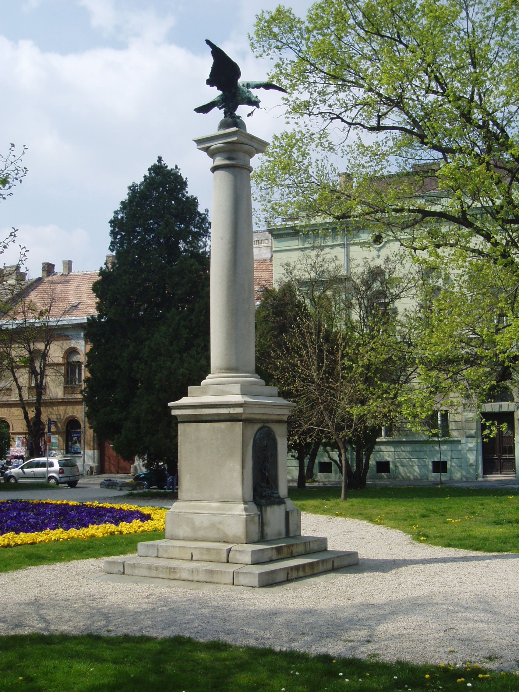 Nyilvános 983 | 1914 | Pápa, Március 15. tér: Honvéd emlékmű | A református templom előtti kis parkban, a Jókai utca felőli oldalon álló Honvéd emlékmű ifj. Vastagh György alkotása. 1896-ban állították fel a Pápa melletti ihászi csata emlékére. A hengeres oszlopon kiterjesztett szárnyú, bronz turulmadár ül. A négyzetes talapzaton levő bronzrelief csatajelenetet ábrázol. A szabadságharc egyetlen Veszprém megyei csatája 1849. június 27-én zajlott le Ihász térségében (korábban, június 13-án Kmetty György győzelmet aratott Csornán). Június 27-én az ihászi pusztán Kmetty megtámadta a Marcaltő elfoglalására siető Schütte osztrák tábornokot. A csata nem végződött egyértelmű győzelemmel, de a magyaroknak heves ágyútűzzel sikerült hátráltatni az osztákokat. Azonban az erős osztrák lovasság Kmetty csapatait végül visszanyomta Pápa felé. A fénykép 2007 áprilisában készült. Felh. irod.: Németh Adél - Szabó Lajos: Pápa. Bp. Panoráma, 1989 |