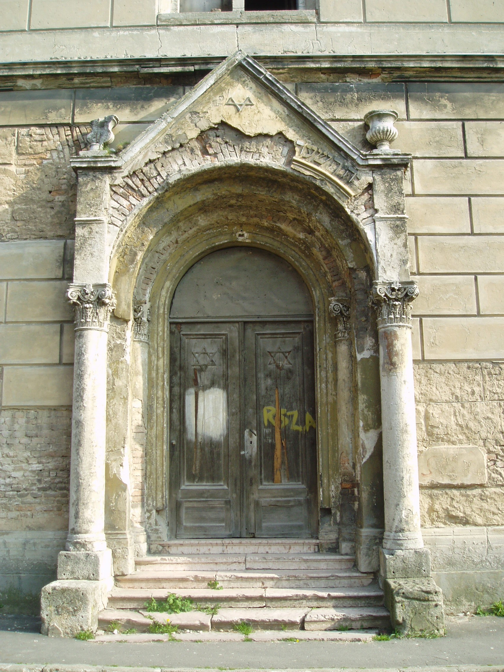 Nyilvános 936 | 1585 | Pápa, Petőfi utca 21. Zsinagóga | A napjainkig eredeti formában fennmaradt zsinagóga építését 1844-ben kezdték el. A 398 m2 alapterületű, közel 20 méter magas épületet Löw Lipót rabbi szentelte fel 1846-ban. A főbejárat a vallási előírásoknak megfelelően a nyugati oldalon található. A zsinagóga puritán külső megjelenését csak a félköríves fülkékbe helyezett romantikus ikerablakok és a klasszicizáló oldalkijárat díszíti. A kétszintes karzatszerkezettel rendelkező, dekoratívan festett belső térben nyolcszáz férfi számára volt ülőhely. Az épület jelenleg (2007) rendkívül elhanyagolt állapotban van, felújításra vár. A fénykép 2007 áprilisában készült. Felh. irod.: Németh Adél - Szabó Lajos: Pápa. Bp. Panoráma, 1989 www.papa.hu |