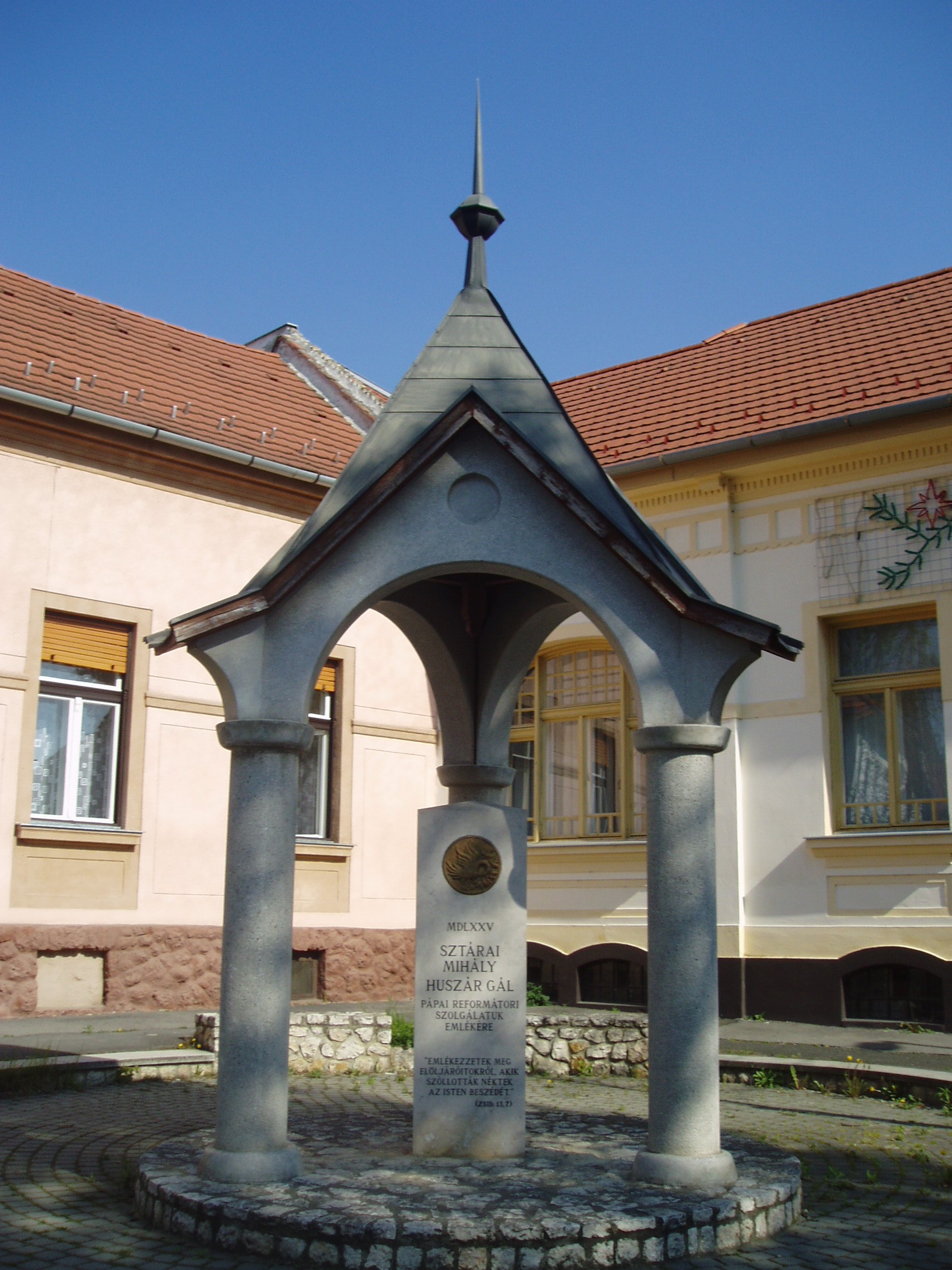 Nyilvános 950 | 1721 | Pápa, Zimmermann utca 4. Sztárai Mihály és Huszár Gál emlékműve | Pápán szinte a reformáció kezdetétől hódítottak a protestánsok tanai. Így Sopron és Sárvár után ez a város lett a protestantizmus harmadik legjelentősebb dunántúli szellemi központja. Lelkész volt a városban Sztárai Mihály, valamint Huszár Gál és fia, Dávid. Sztárai Mihály (Drávasztára? – Pápa, 1575?), a nagy „éneklő reformátor” ferences szerzetesből lett a reformáció híve és egyik legeredményesebb terjesztője. Laskón (Tolna megye), majd Tolna városában, később Sárospatakon működött, onnét jött Pápára 1567 őszén. Hét–nyolc évet töltött itt lelkészként, utolsó éveiben Huszár Gállal együtt. Huszár Gál (1512 k. – Pápa, 1575. okt. 23.) eredetileg katolikus pap volt, de csatlakozott a reformációhoz, s a katolikus egyház kiátkozta. Egész nagyhatású munkásságát a reformáció szolgálatába állította. Zaklatott életet élt, mert az ellenreformáció többször elűzte helyéről: Magyaróvárott, Kassán, Debrecenben, Nagyszombaton, Komáromban, Rózsavölgyben, Komjátiban tevékenykedett. Élete utolsó évét töltötte Pápán, ahol 1575. október 23-án, 63 éves korában pestisben hunyt el. Halála napját állítólag korábban többször megjövendölte. Tevékenységét a városban fia, Huszár Dávid folytatta, aki 1577-ben itt nyomtatta ki a Heidelbergi Káté első magyar fordítását. Sztárai Mihály és Huszár Gál közös emlékművét a Zimmermann utca 4. számú épület előtt állították fel, közel az Anna térhez, amelynek azóta felszámolt temetőjében nyugodtak a hagyomány szerint Huszár Gál hamvai. A fénykép 2007 áprilisában készült. Felh. irod.: Németh Adél – Szabó Lajos: Pápa. Bp. Panoráma, 1989 Pápa. Szerk. Sz. Farkas Aranka. 2. kiad. Veszprém-Bp., Magyar Képek, 2000. http://church.lutheran.hu/reformatio/ppanteon/pp_ev_huszar_gal.htm Fabiny Tibor: Az evangélikusok Pápán. = w.mek.iif.hu/porta/szint/tarsad/tortenel/helytort/papa_1 |