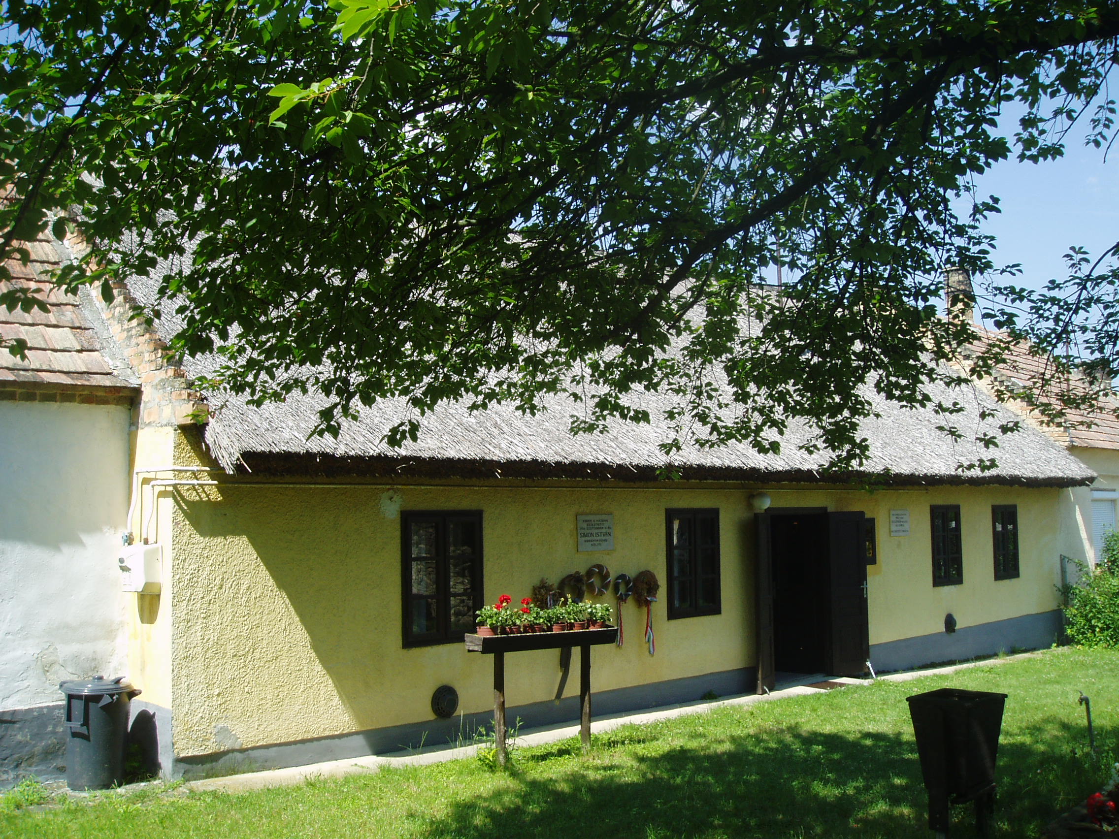 Nyilvános 1135 | 2680 | Bazsi, Fő út 149. | 1926. szeptember 16-án itt, az udvari házrészben született Simon István költő. A kis épületet 1983. április 11-én, a költészet napján, országos ünnepség keretében avatták emlékházzá. Benne ma is a költő szüleinek eredeti bútorai és tárgyai láthatók, Simon Istvánról szóló dokumentációval kiegészítve. Simon István tizennyolc éves koráig élt Bazsiban. A sümegi gimnáziumot bejáró diákként végezte el. 1948-tól Budapesten lakott, de gyakran hazajárt szülőfalujába. Számos, ebben a házban készült fényképen látható idős szüleivel a már nagy elismertséget elért költő. 1975 nyarán nagybetegen került a sümegi kórházba, ahol július 6-án elhunyt. Kívánságának megfelelően Bazsiban temették el (sírjánál sajnos nem jártam, a temető elég messze van a falutól - K.K.). A szegényparaszti környezet, a szülőföld, a Sümeg környéki táj mindvégig éltető eleme volt költészetének. A fénykép 2007 júniusában készült. Felh. irod.: Erős Zoltán: Magyar irodalmi helynevek A-tól Z-ig. Bp. Kis-Lant Kiadó, 1995 |