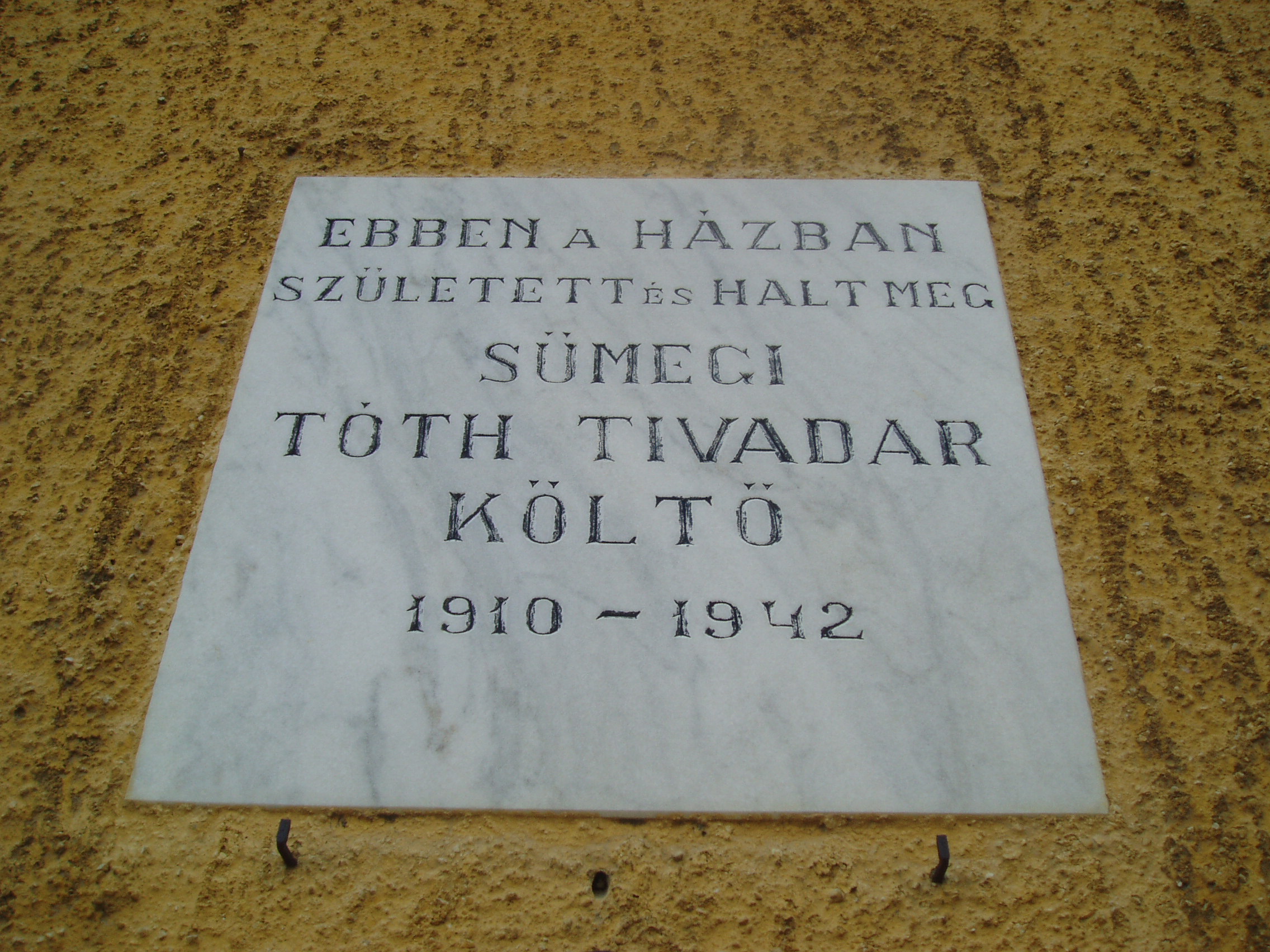 Nyilvános 910 | 1580 | Sümeg, Cseh L. utca 1. | Mint az épület homlokzatán elhelyezett emléktáblán is olvasható, ebben a házban született és halt meg Sümegi Tóth Tivadar költő. Sümegi Tóth Tivadar (Sümeg, 1910. nov. 19. – Sümeg, 1942. aug. 15.) költő. Középiskola tanulmányok után sok mindennel próbálkozott, sokáig Budapesten volt tisztviselő. Hányatott sorsáról népies ízű, fanyar hangulatú versei tanúskodnak. A Magyar Élet és a Kelet Népe közölte költeményeit. Versei terjesztésének különleges módját választotta. Előbb kézírással, majd indigós gépeléssel 5–6 versét adta közre pár oldalas kis füzetekben. Fiatalon, tüdőbajban hunyt el. Verseinek gyűjteményes kötete 1995-ben jelent meg Életért kiáltok címmel a Sümegi írások sorozatban. A sümegi Városi temetőben nyugszik. A városban utca viseli nevét. A fénykép 2007 júniusában készült. Felh. irod.: Veszprém megyei életrajzi lexikon. Veszprém, 1998 |