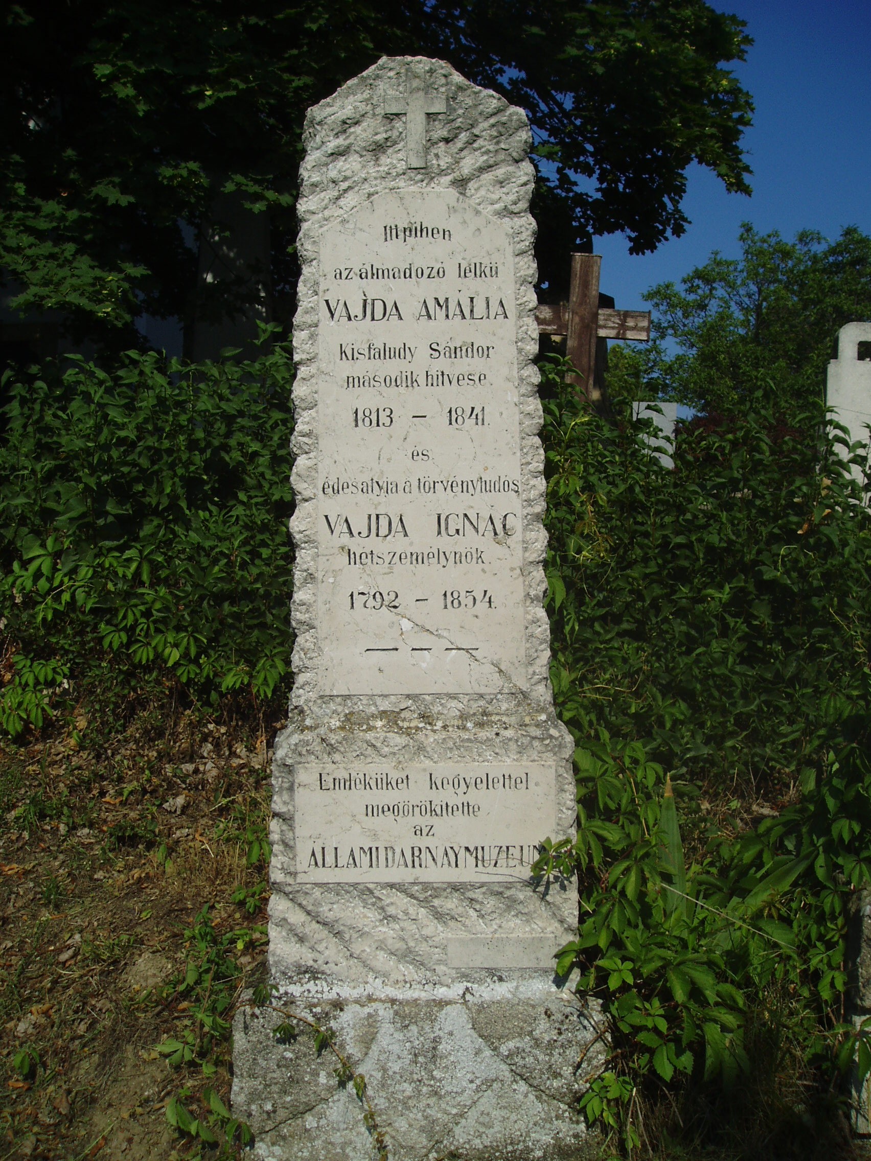 Nyilvános 918 | 2699 | Sümeg, Temető. Vajda Ignác és Amália sírja | Sümeg délkeleti határában, a Tapolcára vezető út mellett emelkedő lankás domboldalon találjuk a város köztemetőjét. Helyét még Bíró Márton püspök jelölte ki; jelentősebb számban a XIX. század eleje óta kezdtek ide temetkezni. A temetődomb tetején áll az 1816-ban épített, későbarokk stílusú temetőkápolna. Körülötte a sümegi élet utolsó két évszázada szinte valamennyi híres személyiségének sírja fellelhető. A temetőkápolna közelében nyugszik Vajda Ignác (1792-1854) hétszemélynök, több jogi kézikönyv szerzője és fiatalon elhunyt leánya, Vajda Amália (1813-1841), Kisfaludy Sándor költő második felesége 1834-1841 között. A fénykép 2007 júniusában készült. Felh. irod.: Koppány Tibor - Kozák Károly: Sümeg útikalauz. Veszprém, Idegenforgalmi Hivatal, 1965 Sümegi kalauz. Sümeg, Sümegi Fórum Alapítvány, 1993 Miklósi-Sikes Csaba: Kőbe vésett történelem. A sümegi városi temetők története és sírjelei 1950-ig. Sümeg, Sümegi Fórum Alapítvány, 2002 Veszprém megyei életrajzi lexikon. Veszprém, Veszprém Megyei Önkormányzat Közgyűlése, 1998 |