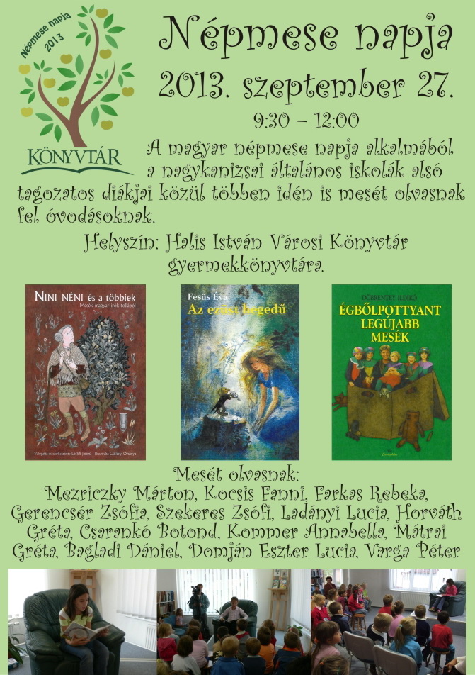 Nyilvános 1425 | 3226 | Népmese napja | 2013. szeptember 27. 9:30 – 12:00 A magyar népmese napja alkalmából a nagykanizsai általános iskolák alsó tagozatos diákjai közül többen idén is mesét olvasnak fel óvodásoknak. Helyszín: Halis István Városi Könyvtár gyermekkönyvtára. Mesét olvasnak: Mezriczky Márton, Kocsis Fanni, Farkas Rebeka, Gerencsér Zsófia, Szekeres Zsófi, Ladányi Lucia, Horváth Gréta, Csarankó Botond, Kommer Annabella, Mátrai Gréta, Bagladi Dániel, Domján Eszter Lucia, Varga Péter |