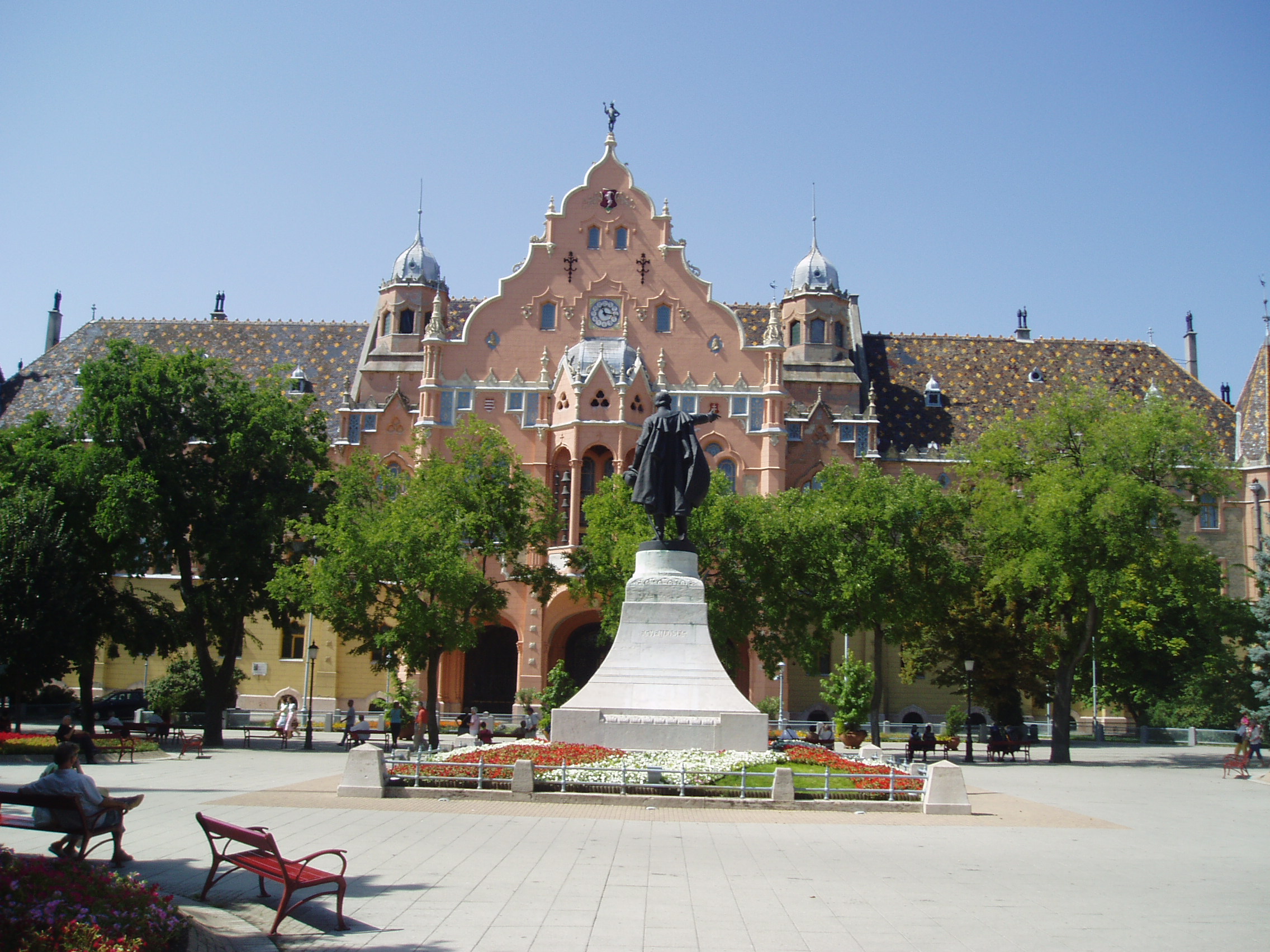Nyilvános 926 | 1768 | Kecskemét, Kossuth tér 1. | A szecessziós stílusú városháza 1892-1896 között épült Lechner Ödön és Pártos Gyula tervei szerint. A külső majolikadíszek a Zsolnay-gyárban készültek. Pompázatos közgyűlési termében Székely Bertalan freskói láthatók. A fénykép 2006 augusztusában készült. Felh. irod.: Heltai Nándor: Kecskemét. Kecskeméti Lapok, 1998 |