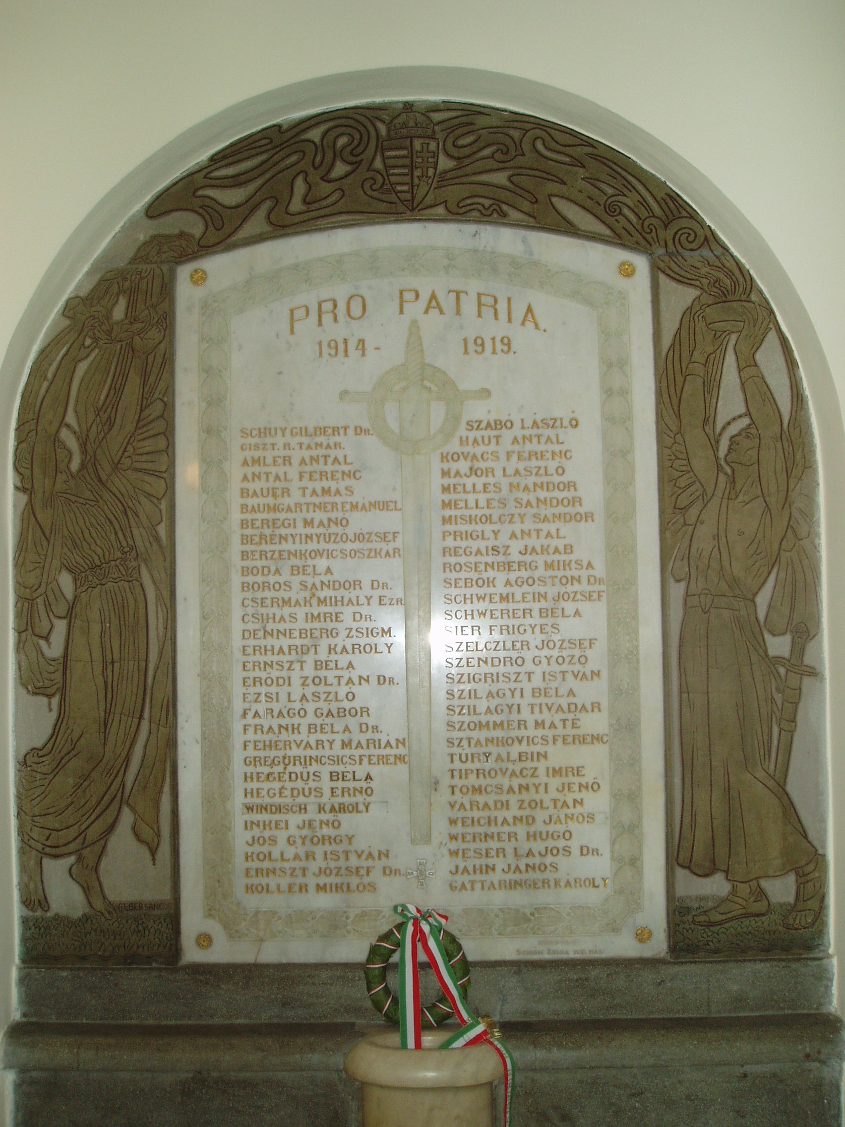 Nyilvános 878 | 1352 | Baja, Szent Imre tér 5. III. Béla Gimnázium | Az 1925-ben felállított első világháborús emléktáblát körülvevő sgrafittót ifj. Éber Sándor bajai születésű képzőművész készítette. Az 1757-ben alapított iskola mai épületét 1815-ben emelték, majd 1892-ben és 1931-ben jelentősen bővítették, alakították. Korábban a közelben ma is álló ferences kolostorban (lásd: Baja, Bartók B. u. 1-3.) folyt a tanítás. Az intézmény a ferencesek után 1879-től a ciszterci rendé lett. III. Béla nevét, aki a ciszter rendet letelepítette Magyarországon, az 1921/22-es tanévben vette fel. Ma már szobra is ott áll az épület előtt. 1948 óta állami iskola. Híres növendéke volt Nagy Ignác író (1819–1821), Türr István (1835–1840), Tóth Kálmán költő (1839–1845), Szarvas Gábor nyelvész (1842–1848). Pályakezdőként az 1905/06-os tanévben itt tanított Babits Mihály. Az iskolának a zenei életben nevet szerzett diákjai is voltak. Ide járt gimnáziumba az 1902/03-as tanévtől nyolc éven át a bajai születésű Kun Imre (1892–1977), a legendás hangversenyrendező és az 1940-es évek elején a szintén Baján született Lukin László (1926–2004) zenepedagógus, karnagy. A fénykép 2007 októberében készült. Felh. irod.: Bálint László: A bajai III. Béla Gimnázium. Bp. Tankönyvkiadó, 1989 Történelmi és kegyeleti emlékhelyek. = www.kjmk.hu/emlek |