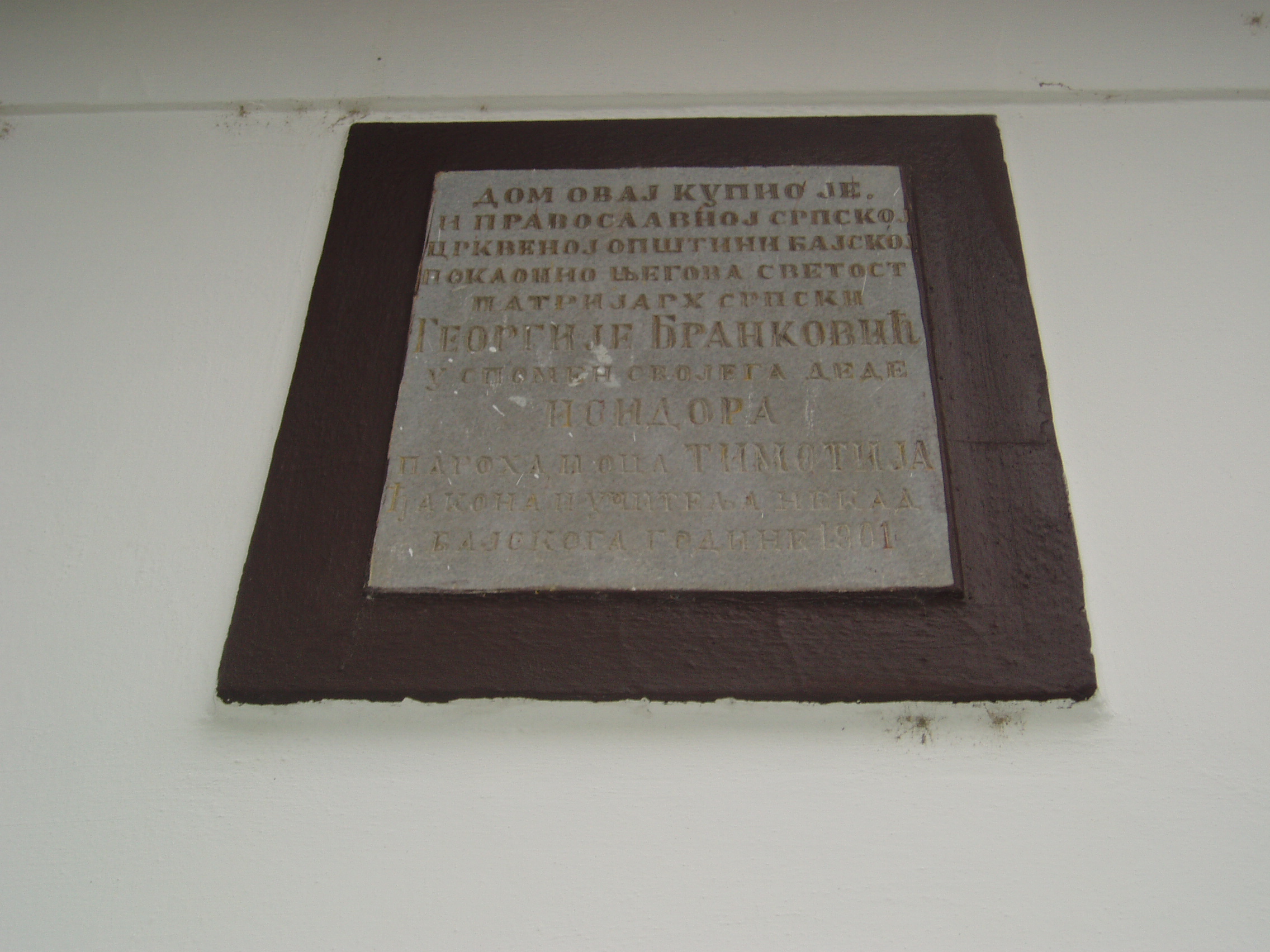 Nyilvános 897 | 1295 | Baja, Táncsics utca 19. | A görögkeleti szerb paplak homlokzatán olvasható emléktábla szövege magyarul a következő: "Ezt a házat Georgije Brankovity szerb pariarcha vette meg és a bajai Görögkeleti Szerb Egyházközségnek adományozta nagyapja, Izidor Paro és apja, Thimotci diakónus és valamikori bajai tanár emlékére 1901-ben." A fénykép 2007 októberében készült. Felh. irod.: Történelmi és kegyeleti emlékhelyek. = www.kjmk.hu/emlek |