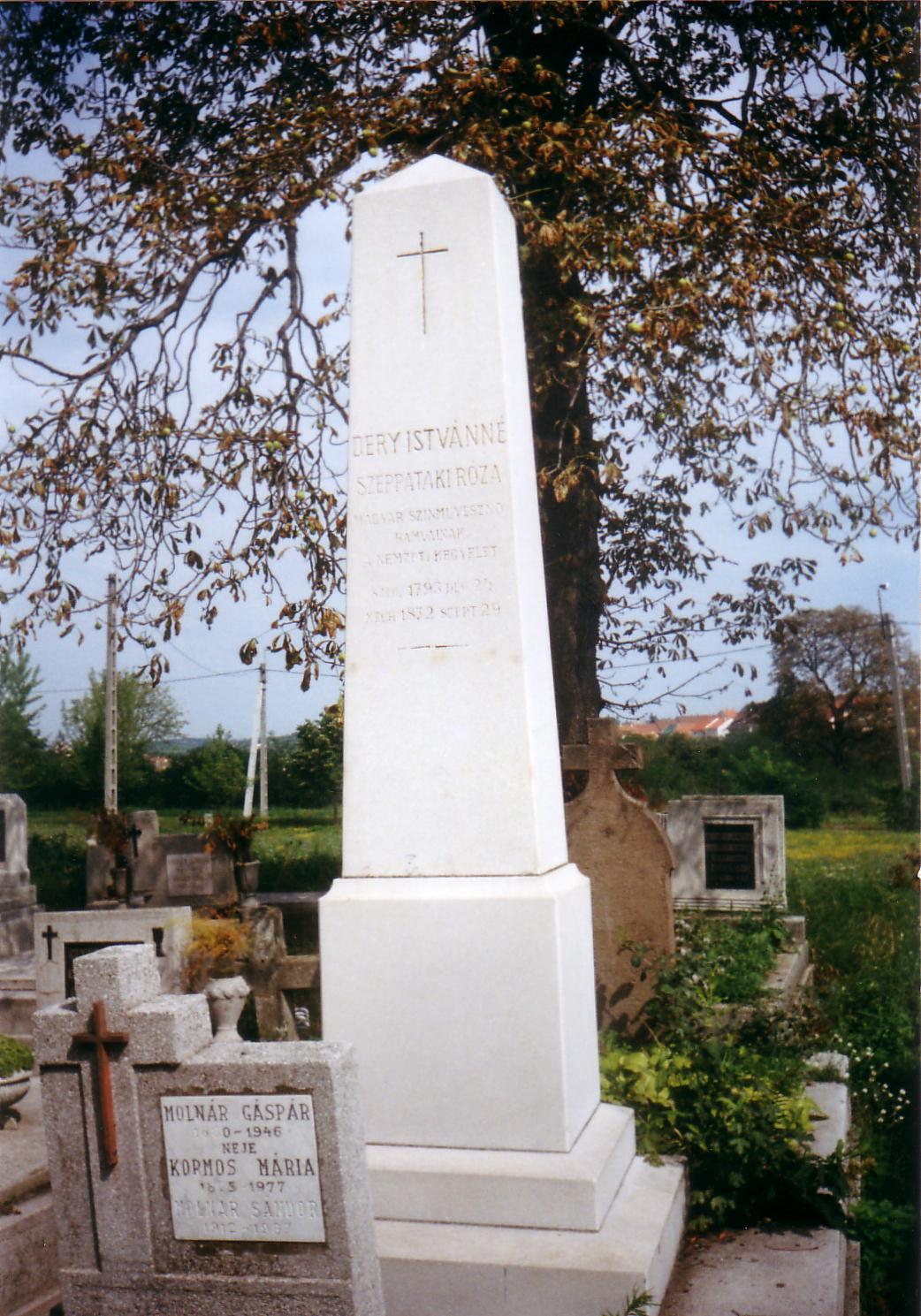 Nyilvános 1382 | 7205 | Miskolc, Szent Anna-temető: Déryné Széppataki Róza sírja | A Szent Anna templom fölött a domboldalon kis temető terül el. Itt van Déryné Széppataki Róza sírja. Déryné 1872. szeptember 29-én, 79 éves korában hunyt el miskolci otthonában, a mai Hunyadi utca 52. számot viselő ház kis udvari lakrészében. Ekkor már özvegyi sorban, szegénységben élt. Utolsó éveiben húgával, Johannával, Kilényi Dávid színigazgató özvegyével lakott együtt Sokáig csak egyszerű fakereszt jelölte sírját. Hogy most látható sírkövét pontosan mikor állították, a miskolci források nem közlik egyértelműen, csak annyi tudható, hogy a fehérmárvány obeliszket „a nemzeti kegyelet” emelte. Felirata: DÉRY ISTVÁNNÉ / SZÉPPATAKI RÓZA / MAGYAR SZÍNMŰVÉSZNŐ / HAMVAINAK / A NEMZETI KEGYELET / SZÜL. 1793. DEC 24 / MEGH. 1872 SZEPT 29 Húga, Johanna 1881 április 18-án hunyt el, Déryné mellé temették. Az ő ma is látható sírkövét „baráti emlékül emelte Latabár Endréné”, a híres miskolci színigazgató özvegye. A fénykép 2002 nyarán készült. Felh. irod.: Cenner Mihály: Déryné alkonya. = A Miskolci Herman Ottó Múzeum Közleményei 14/1975. Saád Andor: Emlékek Dérynéről és húgáról, Széppataki Johannáról. = A Miskolci Herman Ottó Múzeum Közleményei 8. |