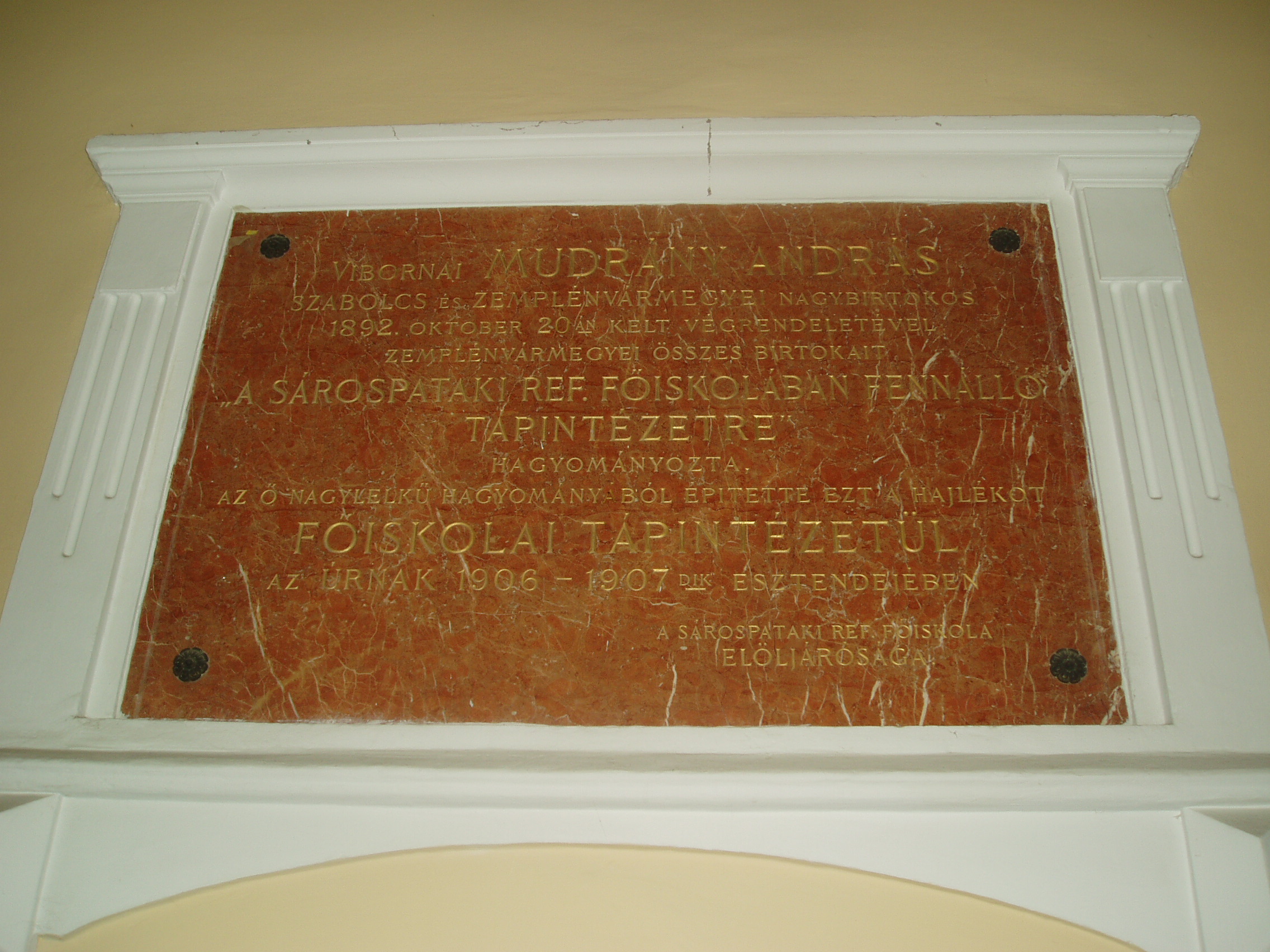Nyilvános 1204 | 2912 | Sárospatak, Comenius utca 1. | Ez volt a pataki kollégium (lásd: Sárospatak, Rákóczi u. 1.) ún. tápintézete, azaz menzája, étkezdéje. Mint emléktáblájáról megtudható, Mudrány András adományából 1907-ben épült. A fénykép 2007 augusztusában készült. Felh. irod.: Látnivalók Borsod-Abaúj-Zemplén megyében. Miskolc, Well-PRess, 1995 |