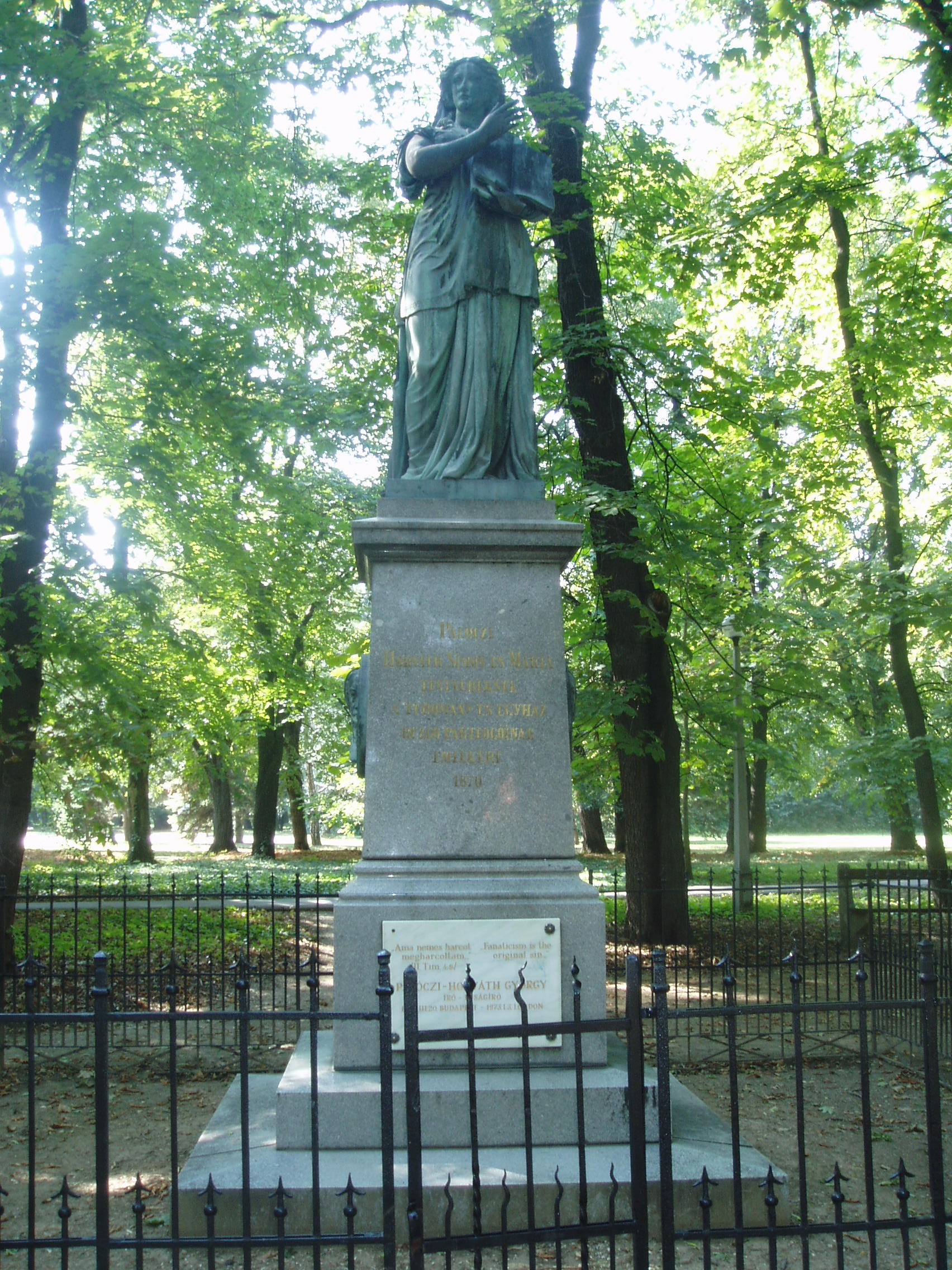 Nyilvános 866 | 1423 | Sárospatak, Iskolakert: Pálóczi-Horváth-emlékmű | A Református Kollégium (lásd: Sárospatak, Rákóczi u. 1.) bejáratával szemben találjuk az Iskolakertnek nevezett parkot. Az 1980-as években természetvédelmi területté nyilvánított Iskolakert sajátos nemzeti érték, mely egyedülálló az országban. Sétányai mentén Patakhoz kötődő jeles személyiségek szobrai állnak. 1870 körül avatták fel az Iskolakertben a Pálóczi-Horváth-testvérek emlékművét. Készítője báró Vay Miklós főiskolai gondnok, szobrászművész. Az álló alakos nő a tudomány múzsája, bal kezében nyitott könyv, benne Bacon-idézet: ”A tudomány hatalom.” Pálóczi-Horváth Simon és testvére, Mária a XIX. század második felében jelentős összegekkel támogatta a református kollégiumot. Az emléművet portrédomborművük díszíti. A fénykép 2007 augusztusában készült. Felh. irod.: Látnivalók Borsod-Abaúj-Zemplén megyében. Miskolc, Well-PRess, 1995 www.sarospatak.hu/nevezetessegek |