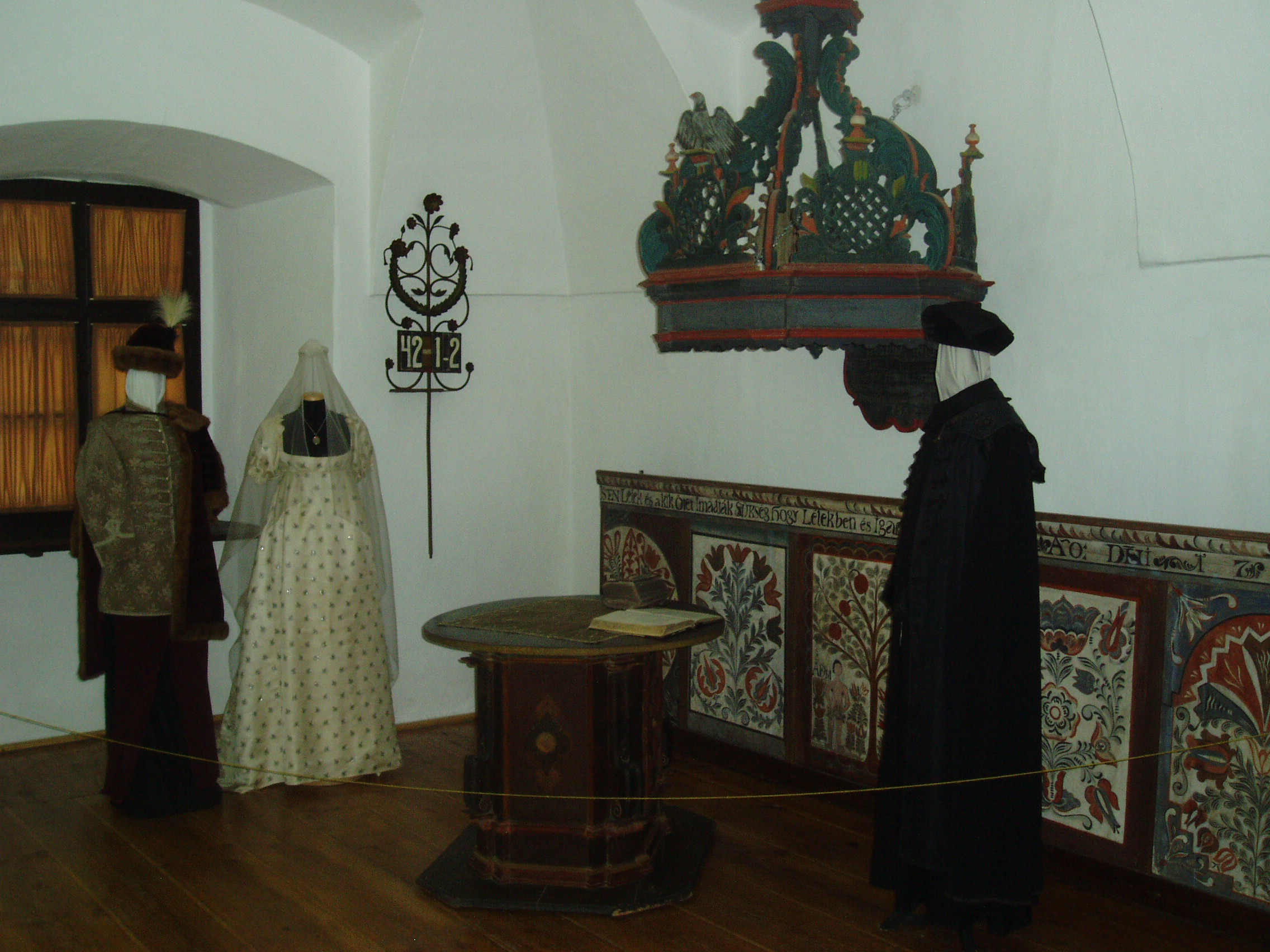 Nyilvános 864 | 1349 | Sárospatak, Rákóczi utca 1. Református Kollégium | A Kollégium főépületének szárnyai által határolt tágas udvarban áll a régi iskolaépületek utolsó maradványa, az ún. Berna-sor. 1771/72-ben a fizika oktatása számára és a fizikaprofesszor lakásául épült. Az egyemeletes, hosszú szárny déli oldalát később kétszintes, árkádos tornáccal bővítették, feljáróval a nyugati oldalon. Az épület a korabeli provinciális magyar építészet szép példája. Az emelet boltozott termeiben a kollégium történetét bemutató kiállítást rendeztek be. A képen az egyházművészeti gyűjtemény legszebb darabjai láthatók, egy korabeli esküvőt rekonstruálva. A fénykép 2007 augusztusában készült. Felh. irod.: Détsy Mihály: Sárospatak. Bp. Corvina, 1974 |