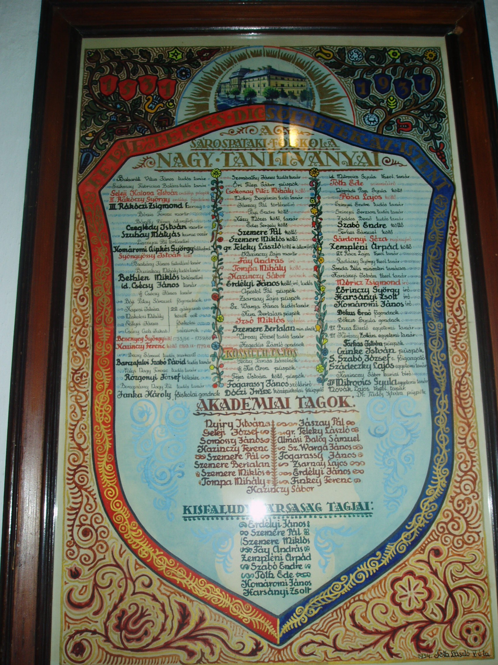 Nyilvános 835 | 1310 | Sárospatak, Rákóczi utca 1. Református Kollégium | A Kollégium főépületének emeleti folyosóján található ez a kézzel festett tábla, mely az intézmény jeles diákjainak neveit örökíti meg. A fénykép 2007 augusztusában készült. |