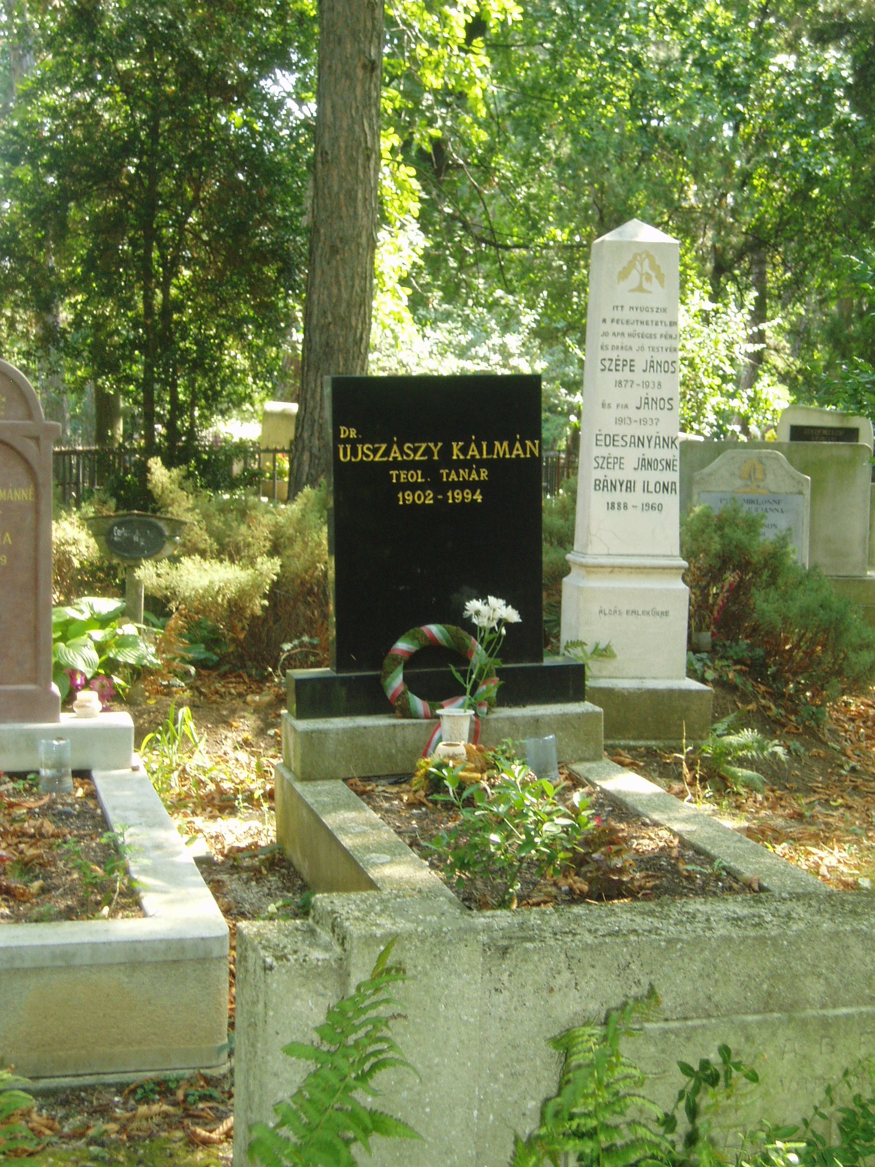 Nyilvános 930 | 4654 | Sárospatak, Vörösmarty utca: Református temető. Gulyás József sírja | A reformátusok 1780-ban megnyitott temetőjében a Református Kollégium (lásd: Sárospatak, Rákóczi u. 1.) számos kiváló professzora nyugszik. Itt van Újszászy Kálmán sírja is is. Újszászy Kálmán Budapesten született 1902. december 13-án; a gimnáziumot is a fővárosban végezte el. 1921-től a sárospataki teológiára járt, 1931-ben ott lett teológiai akadémiai tanár, ezt megelőzően egy-egy évig Glasgow, Basel, Athén protestáns tanintézeteinek hallgatója volt. A pataki teológián a filozófiai-pedagógiai tanszéket vezette, 1932-ben filozófiai doktorátust szerzett Debrecenben, 1939-ben Szegeden egyetemi magántanári képesítést nyert A falunevelés szellemi alapjai című értekezésével. 1931-től a Sárospatakon kibontakozó faluszeminárium, 1936-től a népfőiskola egyik irányítója, 1944-1946 között a főiskola rektora volt. A népfőiskola 1948-ban - kényszerűen - megszűnt, a református intézmények közül a tanítóképzőt 1950-ben, a gimnáziumot 1952-ben államosították. 1951-ben megszüntették a teológiát is, amely 1992-ben kezdte meg újra a működést. Újszászy professzor 1948 után a kollégium főkönyvtárosa, 1951-től a Tiszáninneni Református Egyházkerület Tudományos Gyűjteményeinek szervezője, 1952-től a Magyarországi Református Egyház zempléni egyházmegyéjének gondnoka, 1964-től 1990-ig pedig a Tiszáninneni Egyházkerület főgondnoka volt. Egykori lakását (lásd: Sárospatak, Kazinczy u. 11.) emléktáblával jelölték meg. Ebben a temetőben nyugszik Cs. Szabó László (1905-1984). Életrajzilag nem kötődött Patakhoz, de végakarata az volt, hogy itt nyugodhasson. Londoni könyyvtárát is a Kollégiumnak adományozta (lásd: Sárospatak, Rákóczi u. 1. Repositorium). (Sajnos, amikor ott jártam, se az ő, se Erdélyi János professzor sírját nem találtam meg - K.K.). A fénykép 2007 augusztusában készült. Felh. irod.: Látnivalók Borsod-Abaúj-Zemplén megyében. Miskolc, Well-PRess, 1995 Benda Kálmán beszélgetése a 90 esztendős Újszászy Kálmánnal. = Confessio 1993. 3. |