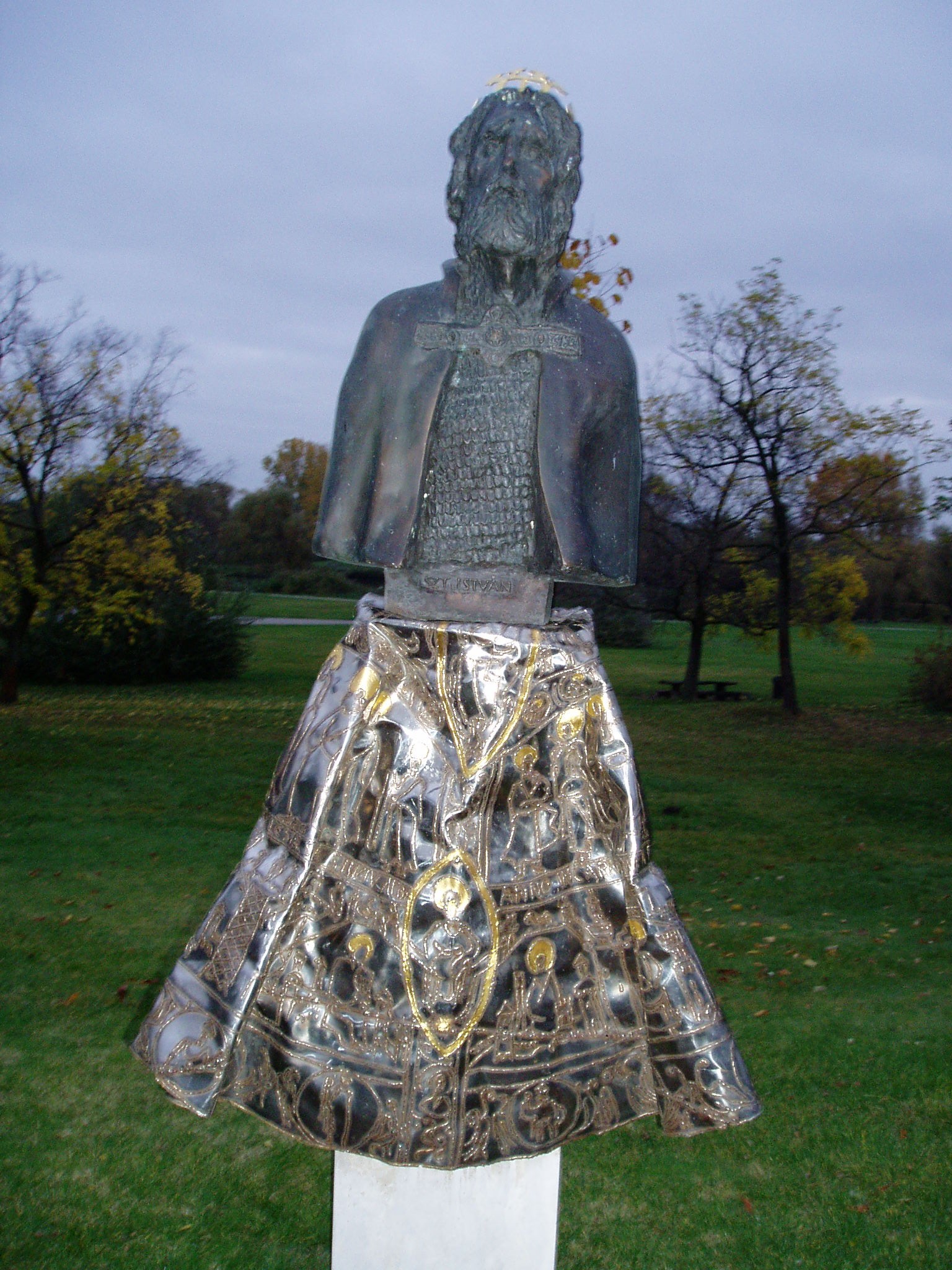 Nyilvános 978 | 1877 | Ópusztaszer: Szent István szobra | Az ópusztaszeri Megyék Történelmi Szoborparkjában Csongrád megye állíttatta I. István király szobrát, mely Varga Imre alkotása. A szobor a romantikus Szent István ábrázolásokkal merészen szakító portré, a korhű István-ábrázolások ihletett továbbgondolása. Arcvonásai felidézik a nomád elődök életvitelén edződött férfiúi jellemvonásokat éppúgy, mint az energikus, magabiztos, hatalma és ereje tudatában lévő államférfi, a keresztény király erényeit. Az aranyozott, krómacél lemezből formált koronázó palást a fél alakot tartó oltárszerű talapzatra borul, Szent István testének megformálójaként jelképesen eggyé forrasztja Szent Istvánt és művét, a keresztény Magyarország megteremtését. A fénykép 2004 októberében készült. Felh. irod.: www.csongrad-megye.hu/turizmus/szoborpark/02.htm |