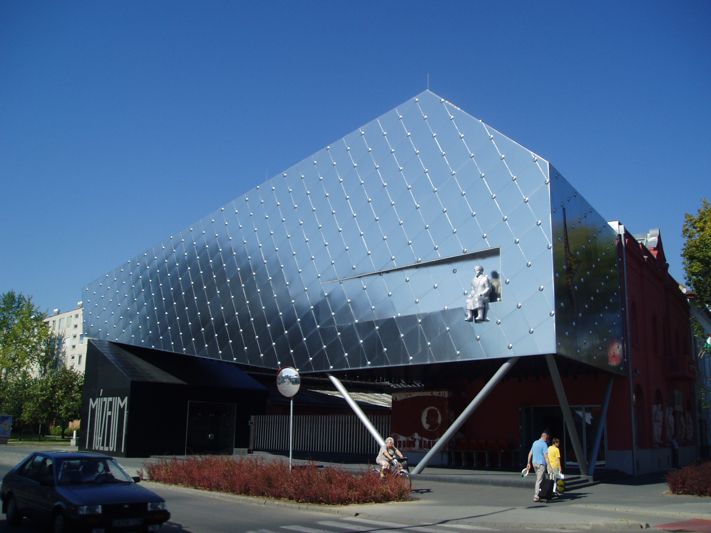 Nyilvános 1204 | 2828 | Rövid leírás | Teljes leírás (1.13 KB) | Hódmezővásárhely, Andrássy utca 34. EmlékPont Az EmlékPont - Fél évszázad Vásárhelyen Humán Oktatási Központ 2006-ban nyílt meg a fő utca egyik polgárházának átépítésével. Az intézmény Magyarországon elsőként egy konkrét város történetén keresztül mutatja be az 1945-1990 közti szocialista korszak történetét. Maga az épület vizuálisan is rendkívül érdekes. A homlokzatot egy egykori Lenin-szobor uralja, lábát lógatva groteszk hatást keltve. A korhű hangulat felidézéséhez több, a rendszerváltáskor "leváltott" szobrot is felhasználtak, de szinte abszurd elhelyezésben. A különleges tárlaton a legkorszerűbb kiállítási-, és múzeumpedagógiai eszközök segítségével elevenednek meg azok a történelmi folyamatok, amelyek Hódmezővásárhely és környéke lakóinak életét meghatározták ebben az időszakban. Az épületben kávéház, könyvesbolt és konferenciaterem is található. A fénykép 2007 júliusában készült. Felh. irod.: www.emlekpont.hu www.vendegvaro.hu |