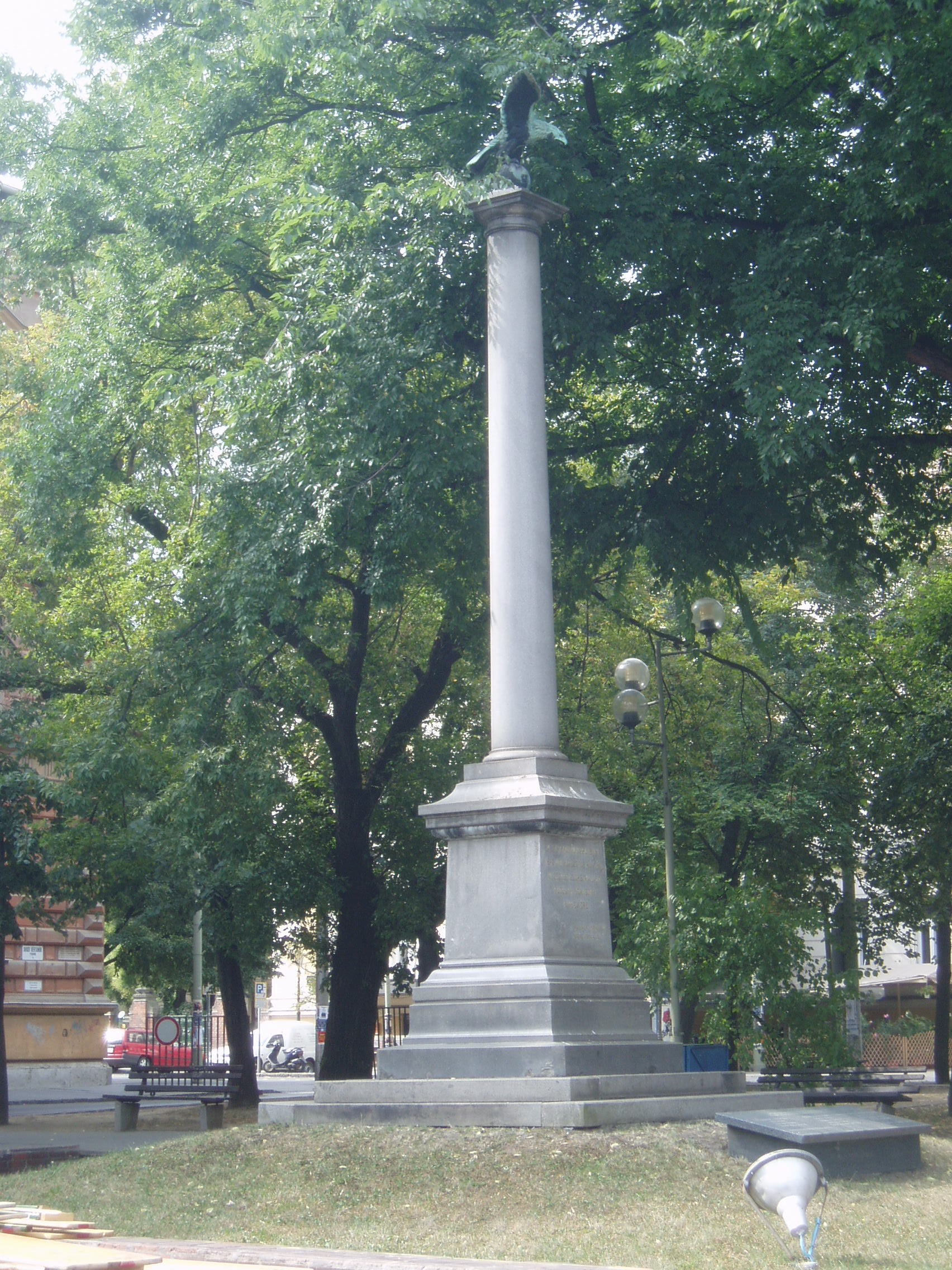 Nyilvános 907 | 3575 | Szeged, Aradi vértanúk tere: a szőregi csata emlékoszlopa | A tér keleti oldalán áll az 1849. augusztus 5-én a közeli Szőregen vívott csata 1896-ban felállított emlékoszlopa, amelyen Bajza József sorai olvashatók. Miután 1849 júliusában Szeged lett az ország fővárosa, Haynau hadserege augusztus 3-án bevonult a városba. Két nap múlva a túlerő legyűrte a szőregi sáncokban védelemre berendezkedett magyar, lengyel és olasz katonákat. Maga Haynau a szegedi városháza (lásd: Szeged, Széchenyi tér 10.) tornyából látcsövön figyelte az eseményeket. A szőregi csatavesztéssel Szegeden, majd hamarosan az egész országban végetért a szabadságharc korszaka. A fénykép 2007 júliusában készült. Felh. irod.: Péter László: Szeged. Bp. Panoráma, 1981 www.bibl.u-szeged.hu/bibl/mil/1848/szoreg/index.html |