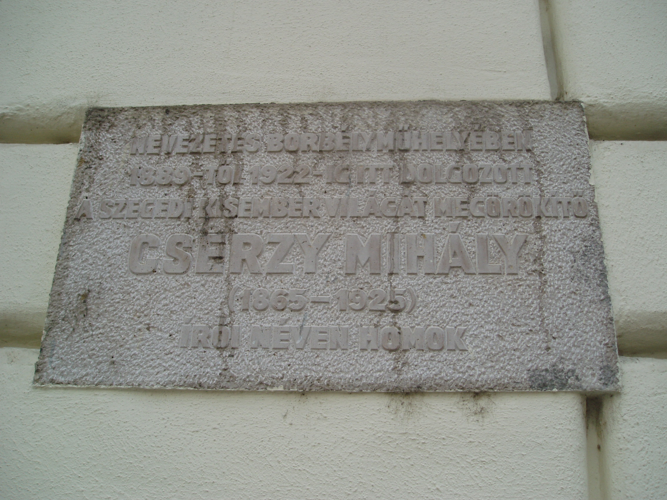 Nyilvános 823 | 1251 | Szeged, Klauzál tér 1. Az új Zsótér-ház | A városi palota Kelemen László utcai oldalán volt Cserzy Mihály, a Homok álnéven publikáló országosan ismert író borbélyműhelye. Nemcsak a szegedi tanyák népének volt érzelmes hangú krónikása, hanem a városi szegénység életének is rokonszenvező, humanista ábrázolója. 1966 óta emléktábla hirdeti, hogy az írónak, aki hajlott koráig kitartott apjának mestersége, a fodrászat mellett, 1889-től 1922-ig itt volt a műhelye. A fénykép 2007 júliusában készült. Felh. irod.: Péter László: Szeged. Bp. Panoráma, 1981 |