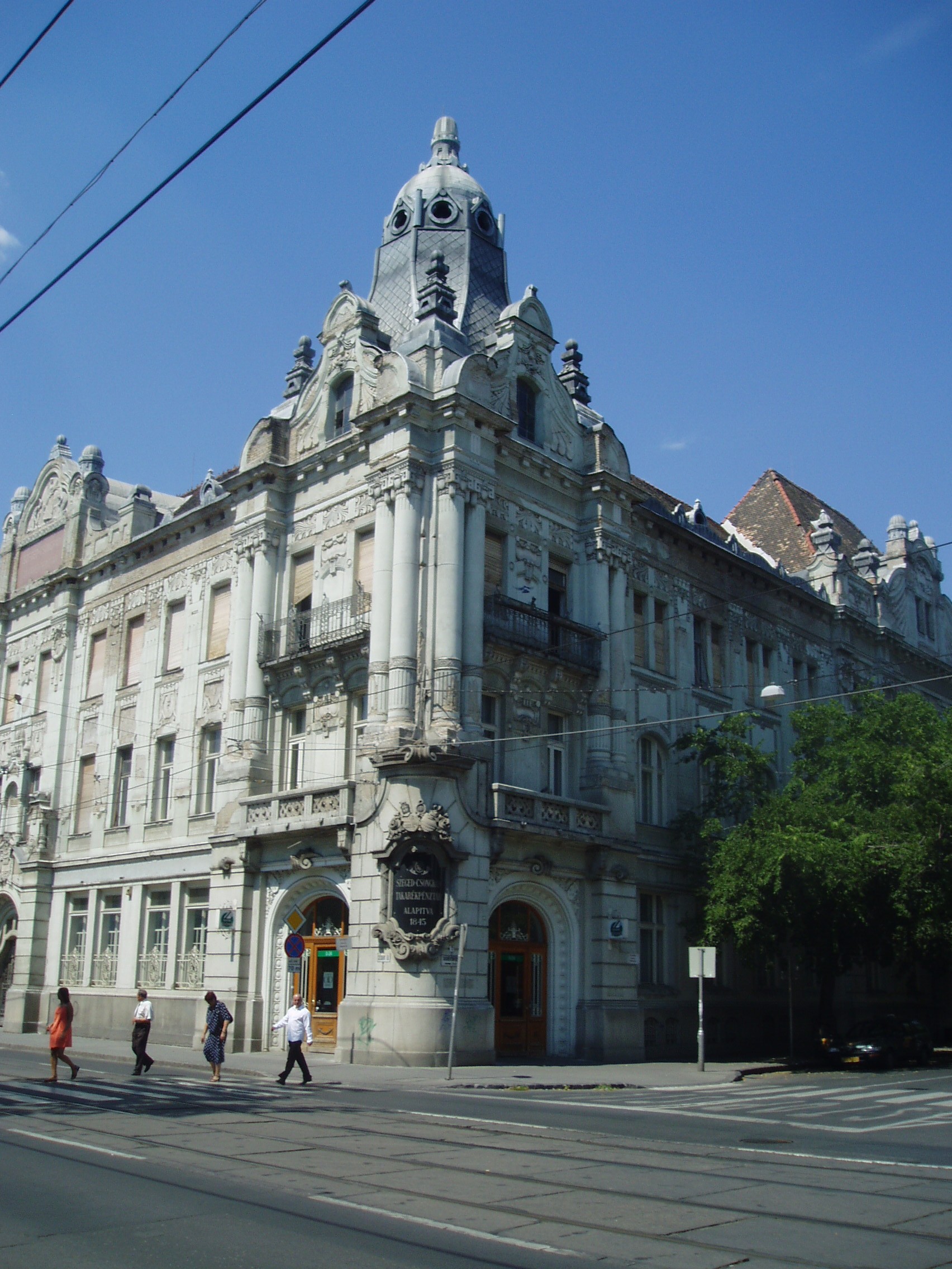 Nyilvános 843 | 1276 | Szeged, Széchenyi tér 7. | A Széchenyi tér Magyarország egyik legszebb, legnagyobb szabályos négyszög alakú tere. 1848-ban Szabadság térnek nevezték el. 1860-ban, halála után kapta a "legnagyobb magyar" nevét. A 7. számot viselő palota 1904-ben Baumhorn Lipót tervei szerint épült 1904-ben szecessziós stílusban az egykori Szeged-Csongrádi Takarékpénztár székházának. A fénykép 2007 júliusában készült. Felh. irod.: Péter László: Szeged. Bp. Panoráma, 1981 |