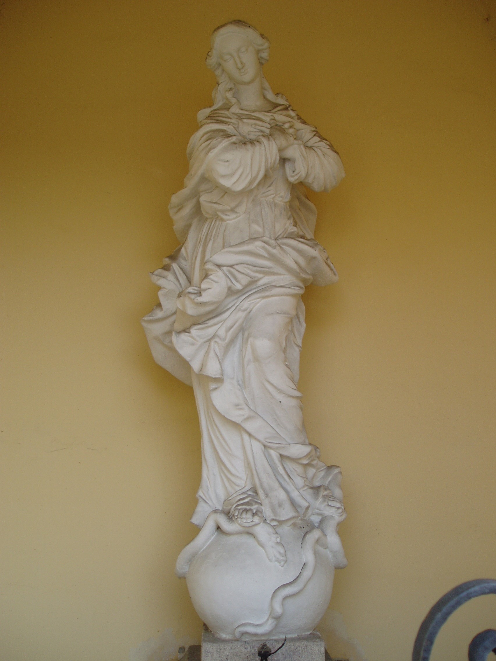 Nyilvános 884 | 1376 | Győr, Bécsi kapu tér: Karmelita templom | A templomból a főkapun kijövet balról, egy régi oltárfülkében áll a Hab Mária-szobor, amely hozzáértők szerint Győr legszebb barokk szoboralkotása. Eredetileg a Rába szigetén állott árvízi emlékként. A XVII. század közepe óta ismert szobor alkotójának Giovanni Giulianit tartják. A felvétel 2008 május végén készült. Felh. irod.: Cziglényi László: Győr. Bp. Panoráma, 1981 |