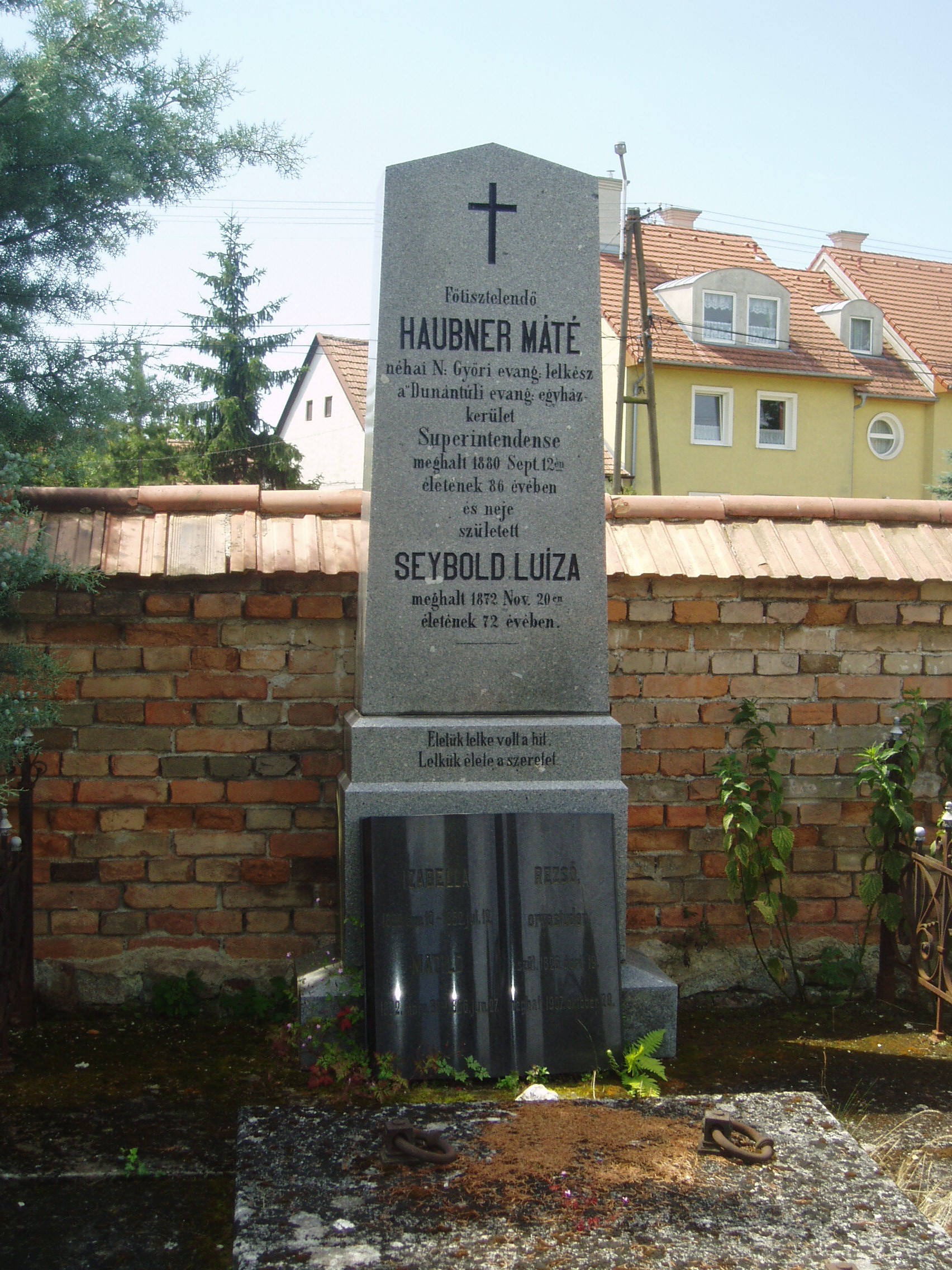 Nyilvános 950 | 3885 | Sopron, Balfi út. Evangélikus temető. Haubner Máté sírja | A soproni evangélikusok 1674-ben nyitották meg temetőjüket, korábban a katolikusokkal együtt a Szent Mihály temetőbe temetkeztek. Haubner Máté (1794-1880) győri evangélikus lelkész volt. 1848/49-ben játszott szerepe miatt két évet Kufsteinben raboskodott. Élete alkonyát Sopronban töltötte. Vagyonát a dunántúli evangélikus egyházkerületi lelkész- és tanítóözvegyek és árvák gyámolítására hagyományozta. A fénykép 2008 júniusában készült. Felh. irod.: A Pallas nagy lexikona |