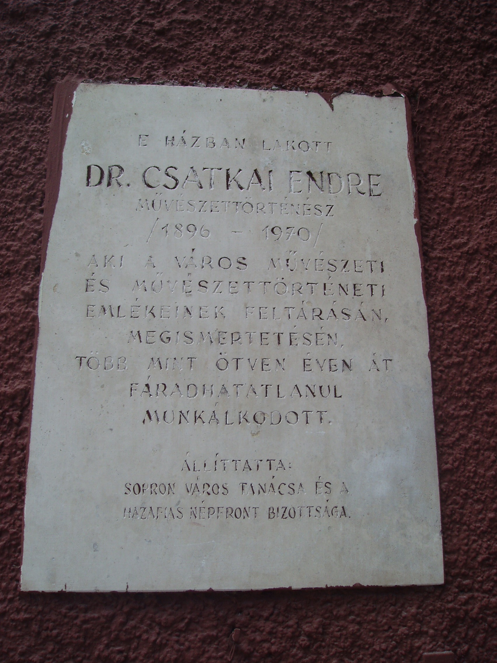 Nyilvános 875 | 1387 | Sopron, Előkapu 10. | Sopron belvárosának főbejárata az északon nyíló Előkapu. Helye már a római korban lakott volt, majd a középkorban erődítésrendszert alakítottak itt ki. A területet a XVIII. század közepétől kezdték beépíteni lakóházakkal. Az itt álló, fűrészfogasan kialakított lakóépületek az egykori erődítés vonalát követik. Mint emléktáblája is tanúsítja, ebben a házban élt Csatkai Endre (1896-1970) művészettörténész, aki Sopron művészeti és művészettörténeti emlékeinek feltárásán, megismertetésén több, mint ötven éven át munkálkodott. Neve és munkássága megkerülhetetlen a Sopronnal ismerkedőknek. A fénykép 2008 júniusában készült. Felh. irod.: Czellár Katalin: Sopron. 3. jav. kiad. Bp. Panoráma, 2000 |
