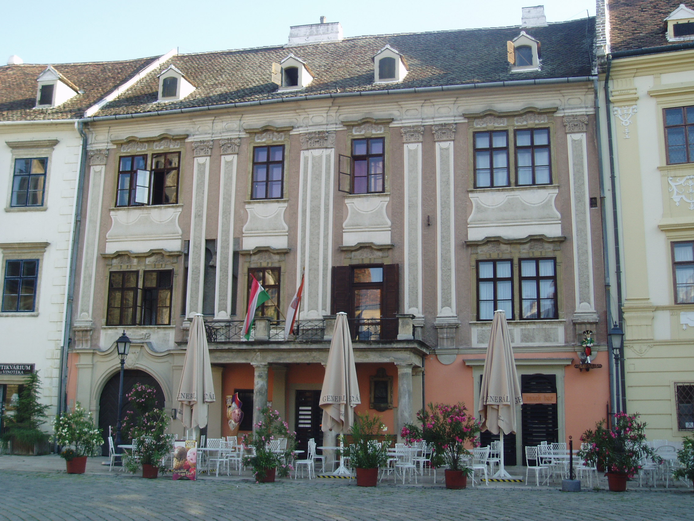 Nyilvános 866 | 1228 | Fő tér 7. Lackner-ház vagy Tábornok-ház | Udvari, keleti szárnya és a toronyhoz csatlakozó háromszintes rész a XV. században épült. A XVII. század elején a legendás polgármester, Lackner Kristóf tulajdona volt. Ebből az időből származhat főhomlokzata. 1631-ben bekövetkezett halálával Lackner kívánságára a városra szállt, azóta is többször átépítették, illetve tűzvész okozta károk után helyreállították. A főhomlokzat előtti klasszicista erkély 180-ból származik. Ide szállásolták el egykor Sopron katonai parancsnokait, másik nevét erről kapta. A kép 2008 júniusában készült. Felh.irod.: Czellár Katalin: Sopron. 3. jav. kiad. Bp. Panoráma, 2000 |
