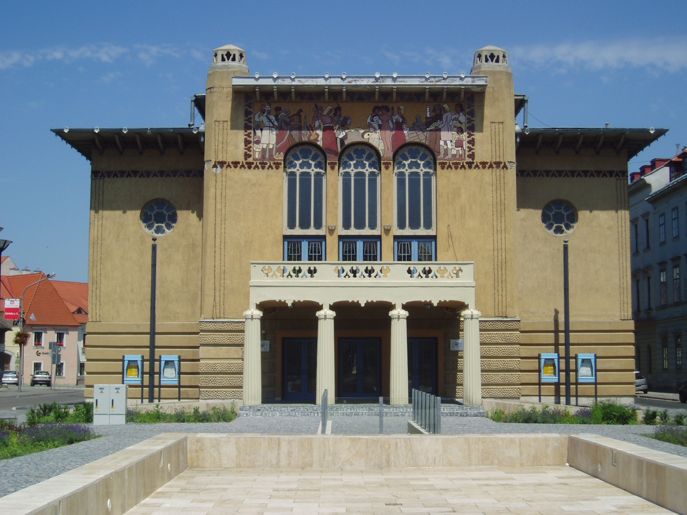 Nyilvános 816 | 1476 | Sopron, Petőfi tér 1. Petőfi Színház | A szecessziós stílusú színház a korábbi épület átalakításával készült Medgyaszay Ferenc tervei alapján. A főhomlokzat nagy sgrafitto képét ifj. Storno Ferenc tervezte. Az erkélyt a régi színház dór oszlopai tartják. A soproni állandó színház léte 1769-ig nyúlik vissza. Egy szárazmalmot alakítottak át ekkor színházzá (lásd: Liszt F. utca 2.), ahol már komoly, bár még elsősorban német nyelvű színházi élet folyt. Ennek közelében, a színház jelenlegi helyén a város 1840-ben emelt új színházépületet, amelynek terveit Franz Lössl, Bécsben tanult építész készítette empire stílusban. Ifjúkorában három évig itt volt karmester Franz von Suppé (1819–1895). Ide szerződött tizennyolc évesen, 1848 októberében Goldmark Károly prímhegedűsnek. Járt a színház épületében mint néző Liszt Ferenc utolsó soproni hangversenye (lásd: Sopron, Széchenyi tér 15.) előestéjén, 1881. április 5-én. A soproni kőszínház 1909-ig működött. Ekkor tűzveszélyessége miatt csaknem teljesen lebontották, csak főfalai és bejáratának dór oszlopai maradtak meg. 1937. október 4-én itt mutatta be a soproni Katolikus Akció Műkedvelői Társulata Kálmán Imre: Csárdáskirálynő című operettjét a szerző jelenlétében, aki műve nyitányát maga vezényelte, majd a díszpáholyból nézte végig az előadást. 1939. május 13-án itt volt az első Éneklő Ifjúság hangverseny, előtte Bárdos Lajos tartott bevezetőt. 1940. május 12-én Kodály Zoltán látogatott Sopronba, aki részt vett és vezényelt is a színházban megtartott Éneklő Ifjúság hangversenyen. Az épületet 1950-ben államosították, s 1969–1975 között nem túl szerencsésen újították fel. A rendszerváltás után lett önálló színtársulata, s az ekkor elvégzett felújítás visszaadta az épületnek a Medgyaszay által tervezett eredeti, azóta már polgárjogot nyert szecessziós vonásokat. A kép 2008 júniusában készült. Felh. irod.: Czellár Katalin: Sopron. 3. jav. kiad. Bp. Panoráma, 2000 Csatkai Endre: Sopron és környéke műemlékei. Bp. Akadémiai Kiadó, 1956 /Magyarország műemléki topográfiája 2./ Hiller István: Kálmán Imre (1882–1953) soproni kapcsolatai. = Soproni Szemle 1982. 1. Nagy Alpár: Kodály Zoltán és Sopron. = Soproni Szemle 1971. 1. |