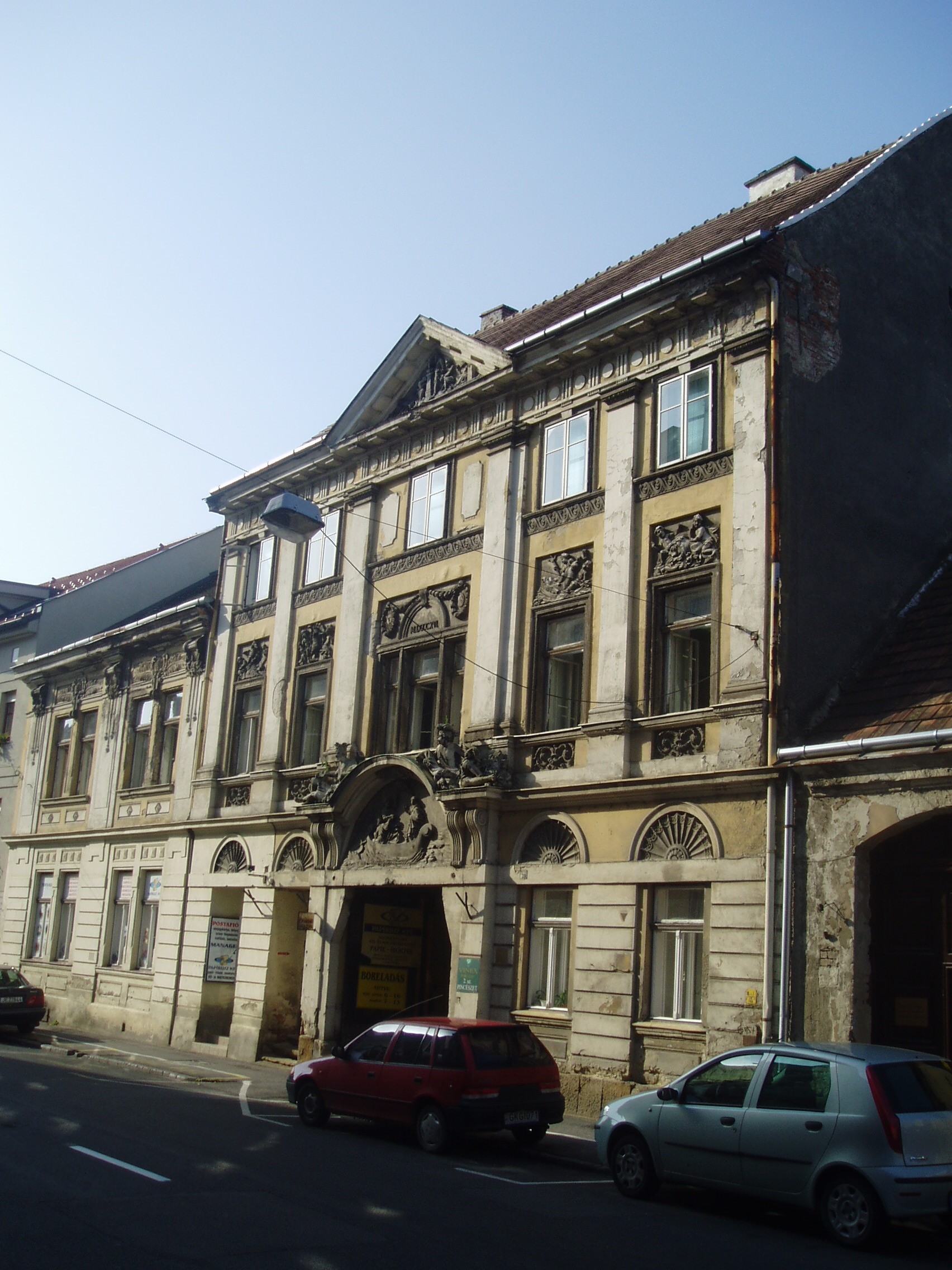 Nyilvános 789 | 1202 | Sopron, Rákóczi utca 39. | A kétemeletes, klasszicista stílusú lakóház 1816-ban Hild vencel tervei szerint Lenk Sámuel nagykereskedő számára épült gazdag szobrászati díszítésekkel. Az övpárkány és a kapu felett a Lenk kereskedőcsalád cégére, két mór faragott figurája látszik. A kő dombormű a csodálatos halászatot ábrázolja. A kép 2008 júniusában készült. Felh. irod.: Czellár Katalin: Sopron. 3. jav. kiad. Bp. Panoráma, 2000 |