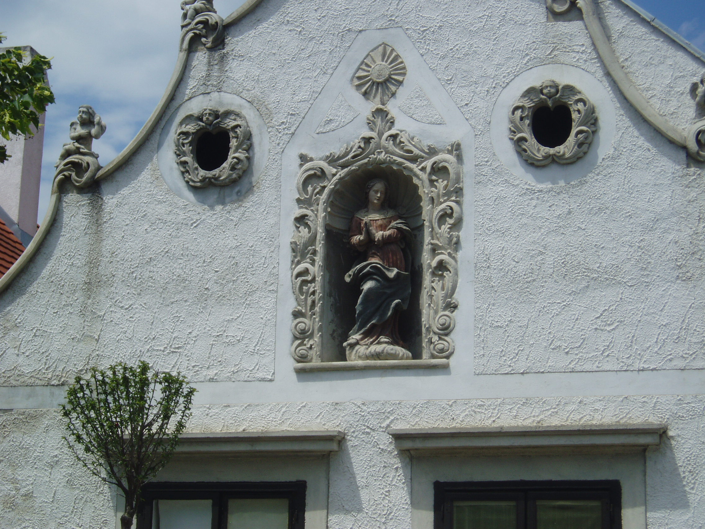 Nyilvános 811 | 1140 | Sopron, Szent Mihály utca 9. Két mór-ház | Az épület két XVII. századi, oromzatos parasztházból alakult ki az 1700-as évek elején. Ekkor Leitner Szervác szobrász volt a tulajdonosa, aki népies barokk stílusban gazdagon díszítette a homlokzatot. A két házat mozgalmas díszítésű kapu köti össze, melyet két korinthoszi csavart oszlop keretez, a tetején egy-egy mór alakjával. Az oromzatok közepén dús keretezésű fülkében Mária, illetve Szent József szobra áll.A fülkék mellett két kis kerek ablak van, gazdag keretezéssel. Az oromzatok hullámos széleit angyalkák díszítik, csúcsukon Szent Flórián és Szent Rókus feje látható. A kép 2008 júniusában készült. Felh. irod.: Czellár Katalin: Sopron. 3. jav. kiad. Bp. Panoráma, 2000 |