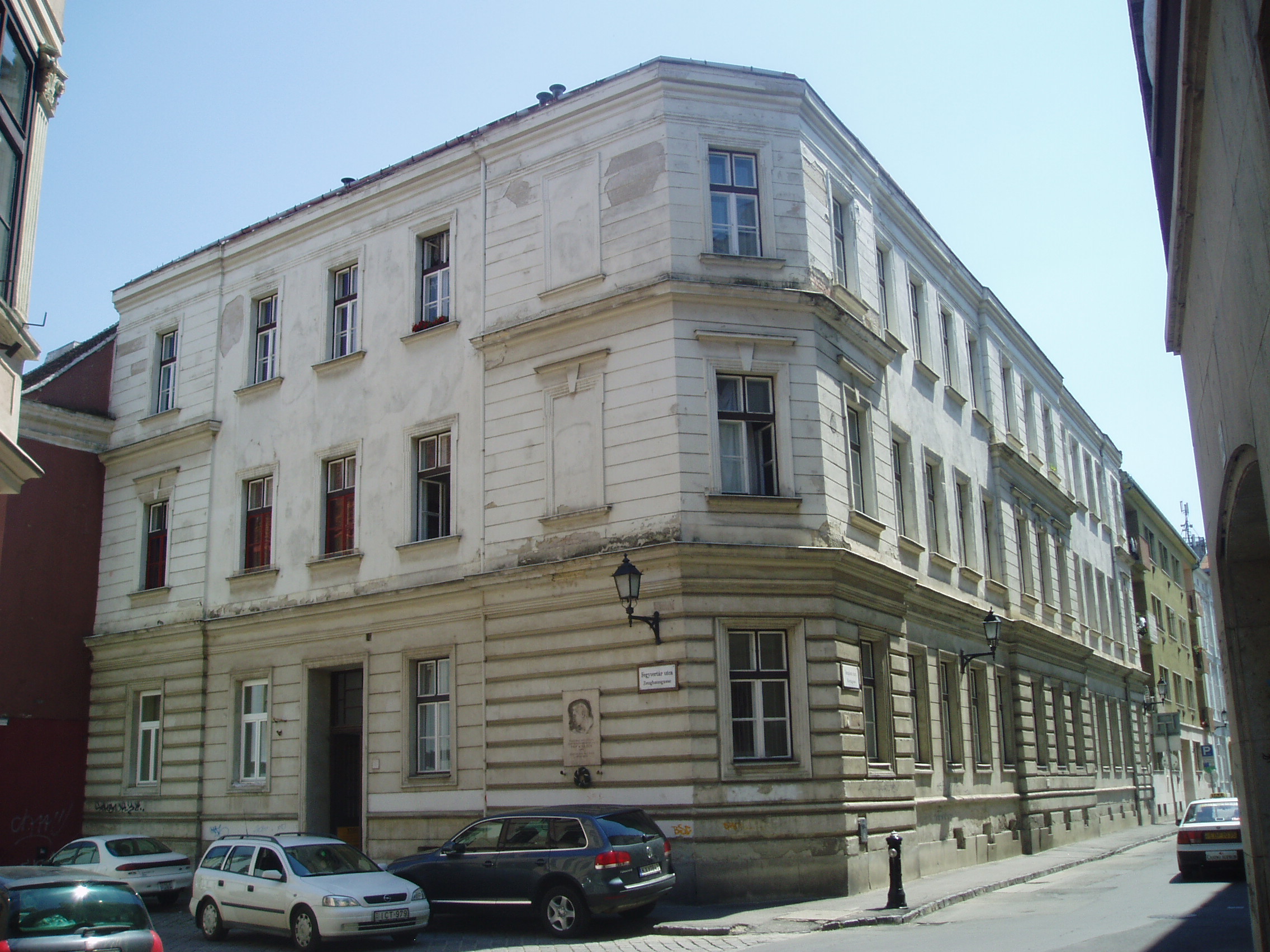 Nyilvános 841 | 1584 | Templom utca 23. | Egykor ezen a helyen állt a neológ zsinagóga, amelyet Schámár János épített neoreneszánsz stílusban. Első és utolsó rabbija dr. Pollák Miksa (1868-1944) volt, aki történészként megírta a soproni zsidóság történetét. A mostani lakóházat Winkler Oszkár tervezte, 1960-ban épült fel. A neológ zsinagóga emléktáblája mellett az épületen egy másik tábla Pap Károly író alakját idézi fel, aki 1897. szeptember 24-én itt született, Pollák Miksa fiaként. A magyar irodalom egyik legeredetibb hangú prózaírója a buchenwaldi haláltáborban pusztult el. A kép 2008 júniusában készült. Felh. irod.: Czellár Katalin: Sopron. 3. jav. kiad. Bp. Panoráma, 2000 Hegedűs Géza: A magyar irodalom arcképcsarnoka. Bp. Trezor, 1992 |