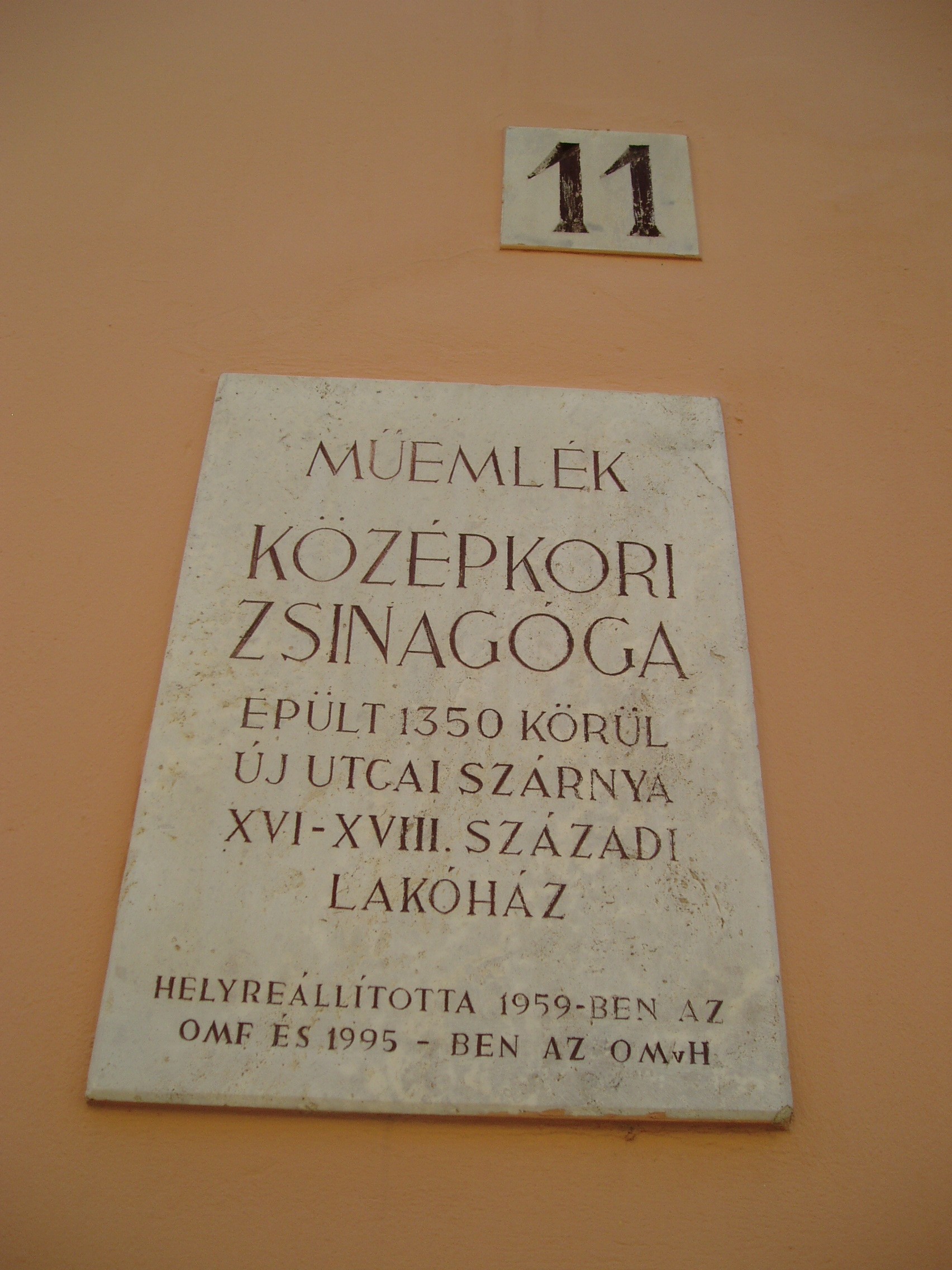 Nyilvános 806 | 1113 | Sopron, Új utca 11. | A középkori eredetű lakóház középkori zsinagógát rejt. Az első zsidók a XIII. században települtek be Sopronba. 1370 körül épült ez az imaházuk, egy Izrael nevű bankár magánzsinagógájaként. A többször átalakított épület egyszerű barokk homlokzatának bal oldalán nyílik a kosáríves kapuzat, amelyen át beléphetünk a középkori templomba: elsőként egy utcára nyíló, boltozatos terembe, majd innét magába a zsinagógába. A két emelet magas termet kétszakaszos keresztboltozat fedi. A keleti falba mélyül az Áron-fülke, azaz a frigyszekrény. A kép 2008 júniusában készült. Felh. irod.: Czellár Katalin: Sopron. 3. jav. kiad. Bp. Panoráma, 2000 |