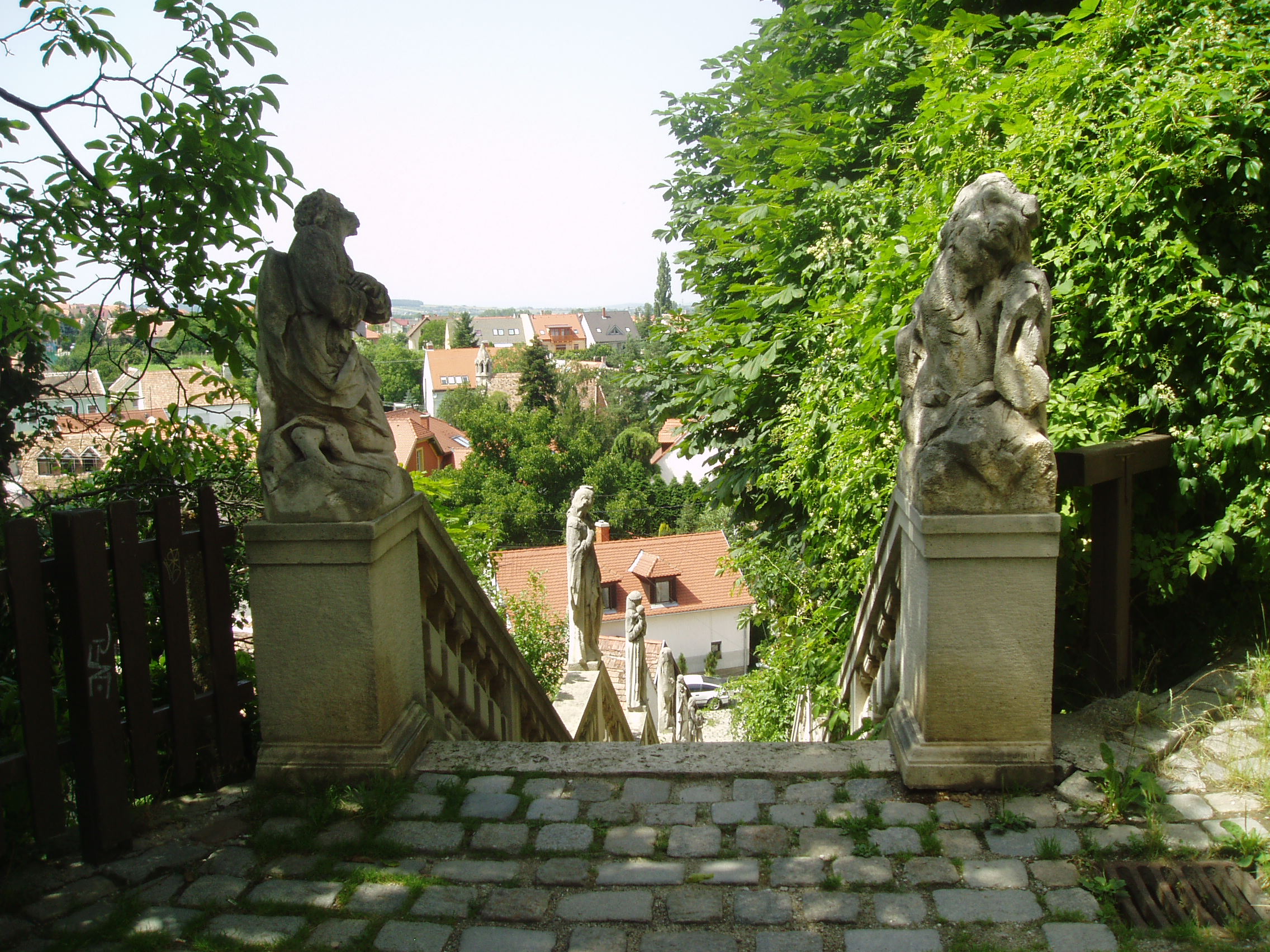 Nyilvános 861 | 1327 | Sopronbánfalva: Kolostorhegy út: Karmelita templom és kolostor | Sopronbánfalva fölött a Sopronból Brennbergbányára vezető út déli oldán magas domb emelkedik. A dombot uraló gótikus eredetű, első formájában a XV. század végén épült templom és a hozzá csatlakozó barokk kolostorszárnyak eredetileg pálos szerzetesek, majd karmelita apácák otthona volt. Az épületegyüttest a település központjával a meredek domboldalban egyenesen húzódó díszes lépcső köti össze, amelyet karmelita-, vagy pálos lépcsőként ismer a köztudat. A lépcső hét lépcsőkarból és hét pihenőből áll. A pihenőkön, a baluszteres mellvéden jobbról-balról egy-egy szent kőszobra áll. A kép 2008 júniusában készült. Felh. irod.: Czellár Katalin: Sopron. 3. jav. kiad. Bp. Panoráma, 2000 |