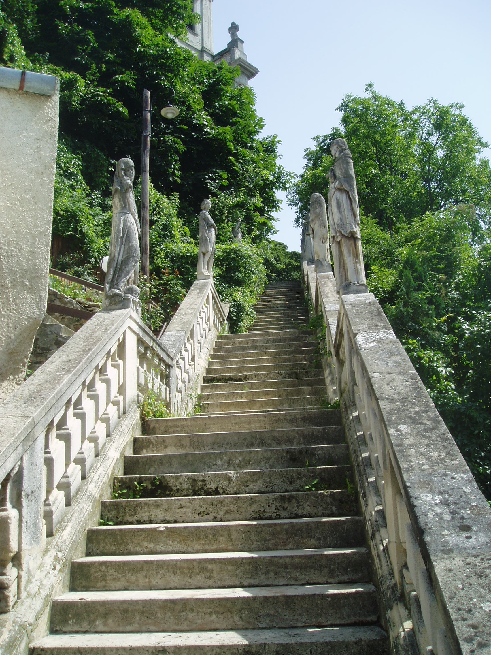 Nyilvános 881 | 2469 | Sopronbánfalva: Kolostorhegy út: Karmelita templom és kolostor | Sopronbánfalva fölött a Sopronból Brennbergbányára vezető út déli oldán magas domb emelkedik. A dombot uraló gótikus eredetű, első formájában a XV. század végén épült templom és a hozzá csatlakozó barokk kolostorszárnyak eredetileg pálos szerzetesek, majd karmelita apácák otthona volt. Az épületegyüttest a település központjával a meredek domboldalban egyenesen húzódó díszes lépcső köti össze, amelyet karmelita-, vagy pálos lépcsőként ismer a köztudat. A lépcső hét lépcsőkarból és hét pihenőből áll. A pihenőkön, a baluszteres mellvéden jobbról-balról egy-egy szent kőszobra áll. A kép 2008 júniusában készült. Felh. irod.: Czellár Katalin: Sopron. 3. jav. kiad. Bp. Panoráma, 2000 |