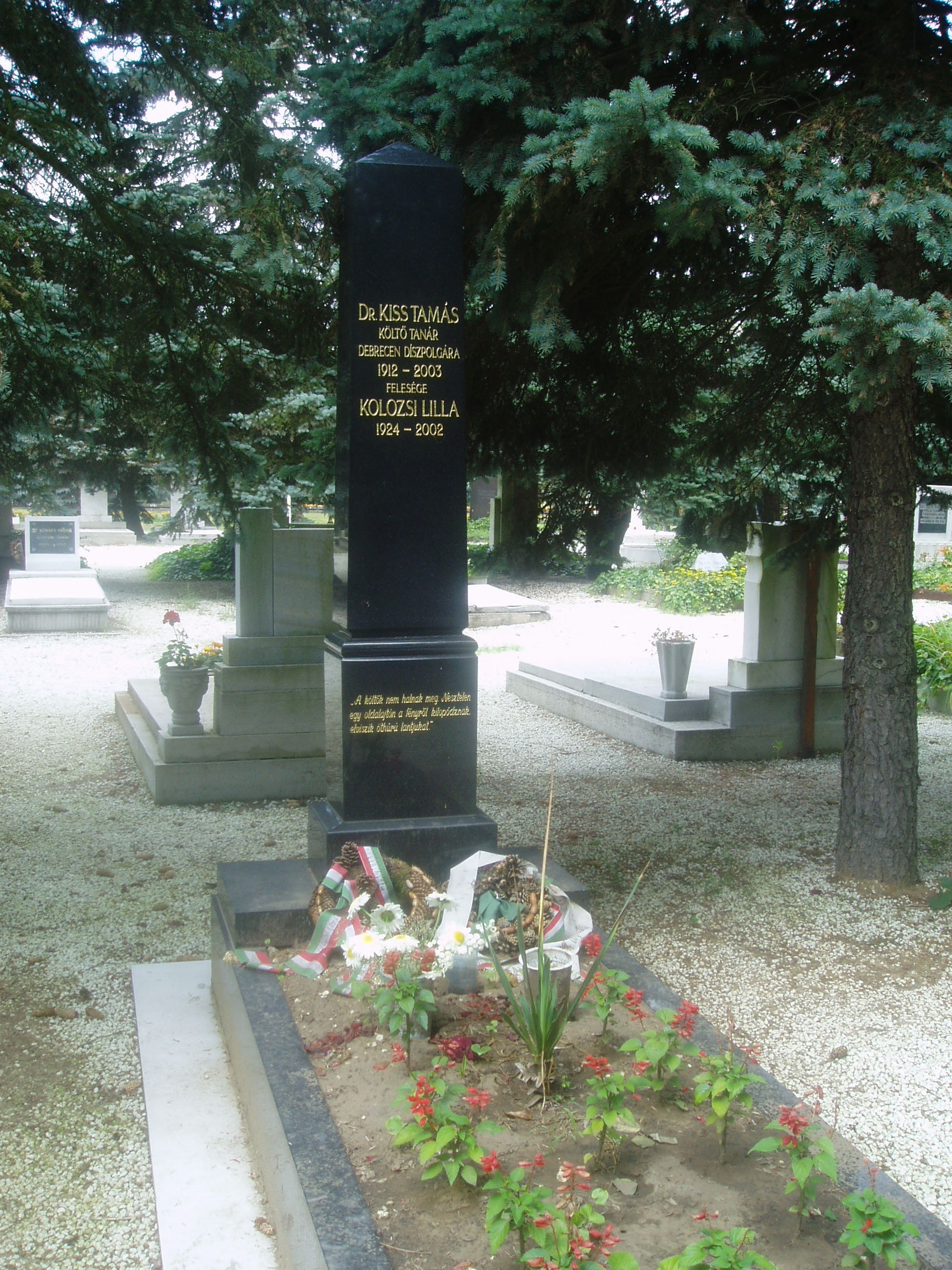 Nyilvános 1288 | 3186 | Rövid leírás | Teljes leírás (1.57 KB) | Debrecen, Bocskai út: Köztemető: Kiss Tamás költő sírja Kiss Tamás (1912-2003) élete négy helyszínhez kötődik. Kisújszálláson született, s élt 18 éves koráig. Debrecenben végezte teológiai tanulmányait, majd segédlelkész bihari falvakban (rövid ideig Kisújszálláson), vallástanár Nagyváradon. Végül ismét Debrecen következett, ahol több mint félévszázadig tevékenykedett, s a város irodalmi és kulturális életének meghatározó alakjává vált. 1947-től a Dóczi Tanítónőképzőben tanított. 1953-tól a Kossuth Gyakorló Gimnázium vezető tanára. A debreceni kollégiumhoz való szoros kötődéséről tanúskodnak "Árkádiában éltünk" címen megjelent esszéi, Csokonai-regénye és a Kollégium múltját népszerűsítő könyvecskéje, "A bagolyvár és lakói". 1983-ban a volt diákok a frissen megalakult debreceni Kollégium Baráti Köre elnökének választották. Mint egy nekrológja fogalmazott: "Ahogy létezik századunkban pannon táj- és élményköltészet, Kiss Tamás azon kevesek egyike volt, akik az alföldi létforma, Debrecen ősi szellemisége meditatív ihletétől fölgazdagodva, intellektuális színezetű életműben barangolták be e különös minőségű kultúrhistória belső lírai tájait." A fénykép 2006 júniusában készült. Felh. irod.: http://kincsestar.radio.hu/panoptikum www.drk.hu/refivil/Dijak.htm www.vagy.hu/cikk.php?id=628 |