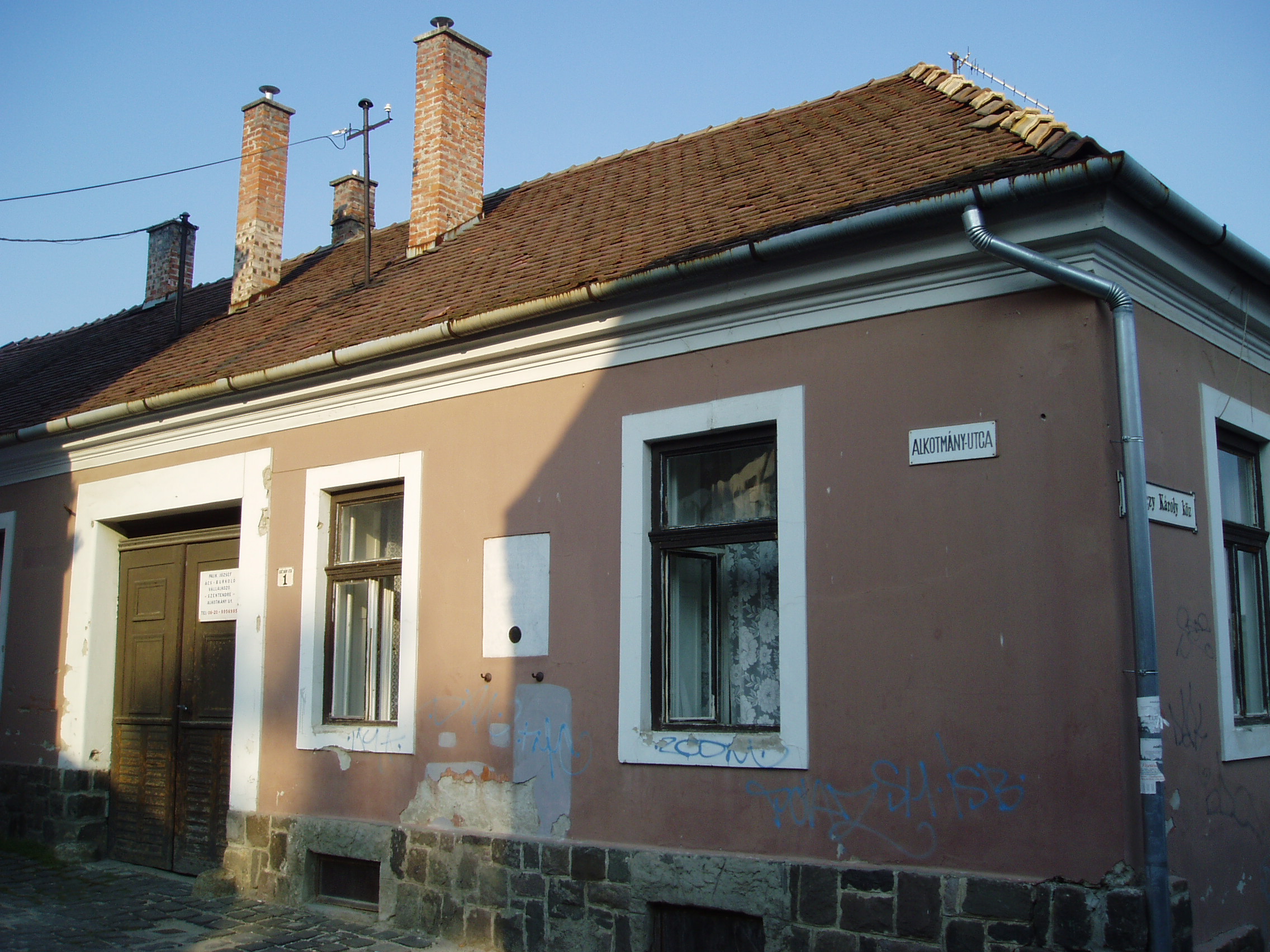 Nyilvános 1200 | 2990 | Szentendre, Alkotmány utca 1. | Ebben a házban élt 1889 és 1892 között Ferenczy Károly festőművész és felesége, Fialka Olga festőművész. 1890-ben itt születtek ikergyermekeik, akik mindketten halhatatlan alakjai a magyar képzőművészetnek: Ferenczy Béni szobrászművész és Ferenczy Noémi gobelinművész. A család legidősebb gyermeke, az 1885-ben született Ferenczy Valér is festőművész volt. A fénykép 2005 szeptemberében készült. |