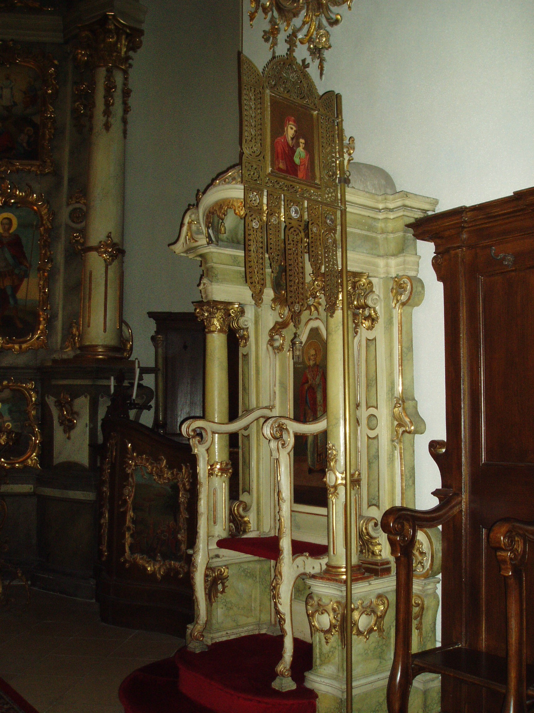 Nyilvános 890 | 1518 | Szentendre, Pátriárka utca: Beográda-templom | A görögkeleti (ortodox) püspöki székesegyház, a Beográda vagy Belgrád-templom az ortodox egyházi élet központja. Helyén egykoron középkori templom állt, majd a XVII. században az ottani politikai helyzet miatt Belgrádból idetelepülők kőből építettek itt templomot. A mai, barokk stílusú katedrális 1756-1764 között készült. A körülzárt kertbe - amelyben a templom és mellette a püspöki palota áll - finom mívű kovácsoltvas díszkapun át juthatunk be. A templom főbejárata mellett áll az a kis épület, melyben a szájhagyomány szerint III. Arsenije pátriárka lakott, ezért azt ma is pátriárkai épületnek nevezik. A székesegyház főhomlokzatában kiemelkedő szerepet kap a 48 méter magas harangtorony; ez Szentendre legmagasabb templomtornya. A templombelső nagy művészettörténeti értéke a nagyméretű ikonosztáz (Ösztovics Vazul szerémségi festőművész készítette 1777/81-ben), az aranyozott, hársfából faragott szószék, valamint a baldachinos püspöki trón. A fénykép 2005 szeptemberében készült. Felh. irod.: Szentendre. Szerk. Sándyné Wolf Katalin. Bp. Panoráma, 1985 www.templom.hu www.vendegvaro.hu |