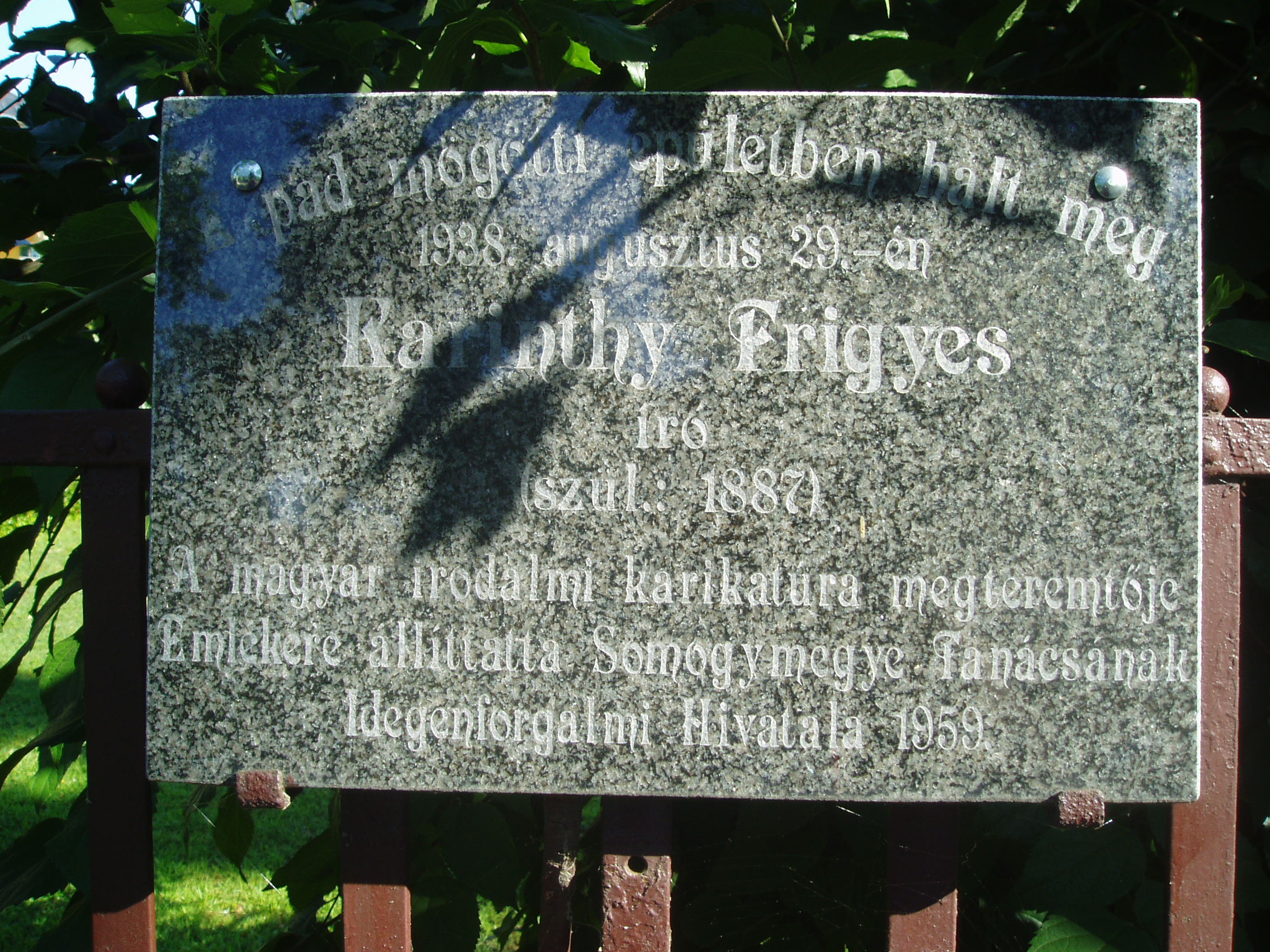 Nyilvános 1000 | 1923 | Siófok, Batthyány utca 46. | Siófok egyik legendás épülete és intézménye a volt Vitéz Panzió. Az épületet az akkori idők egyik legtehetségesebb művésze, a kiskorpádi születésu Kozma Lajos (1884-1948) Kossuth-díjas építész tervezte. Az évtizedek során számos nevezetes vendége volt. Az épület előtt támaszkodik a kerítésnek Karinthy Frigyes emlékpadja. Ebben a házban hunyt el 1938. augusztus 29-én a XX. század legegyetemesebb érdeklődésű és egyik legtermékenyebb magyar írója. Karinthy Frigyes - családjával együtt - évtizedeken keresztül volt a Vitéz Panzió viszatérő vendége. Az író imádta Siófok nyári hangulatát, vendéglőit, a kaszinók éjszakai mondén életét s a délutáni kártyacsatákat. A Stockholmban 1936-ban elvégzett agyműtét után még felépült, de két év múlva itteni szobájában agyvérzést kapott és meghalt. Utolsó estéjén még meglátogatta a panzióban jóbarátja, Rejtő Jenő. Karinthy Frigyes fiai, a tragikus sorsú költő, Karinthy Gábor és Cini, azaz Karinthy Ferenc író is nagyon sokat tartózkodtak itt. Karinthy Ferenc az itteni életet, ifjúságának csínyjeit számos írásában rögzítette. Faludy György költő is lakott a Vitéz-panzióban. “Itt nyaraltunk 1914-től 1918-ig minden nyáron. Apám akkor katona volt. A Batthyány utca 7.-ben laktunk a szüleimmel, illetve apámmal, aki a frontról egyszer meg is látogatott bennünket. Aztán később is megfordultam Vitéz Miklósné panziójában, amikor Karinthy Frigyes is itt nyaralt" - mesélte később a költő. Felmerült az ötlet, hogy az épületben létrehozzák Karinthy Frigyes emlékmúzeumát, de a megvalósítás még messze van. Viszont 1998-ban a Rózsakertben (a Balaton-parton) felállították egészalakos szobrát, Varga Tamás alkotását. A fénykép 2006 júliusában készült. Felh. irod.: http://www.siofok.hu/seta_a_varosban_hu.php Matyikó Sebestyén József: Zsidók Siófokon. Debrecen, Ethnica, 2000 |