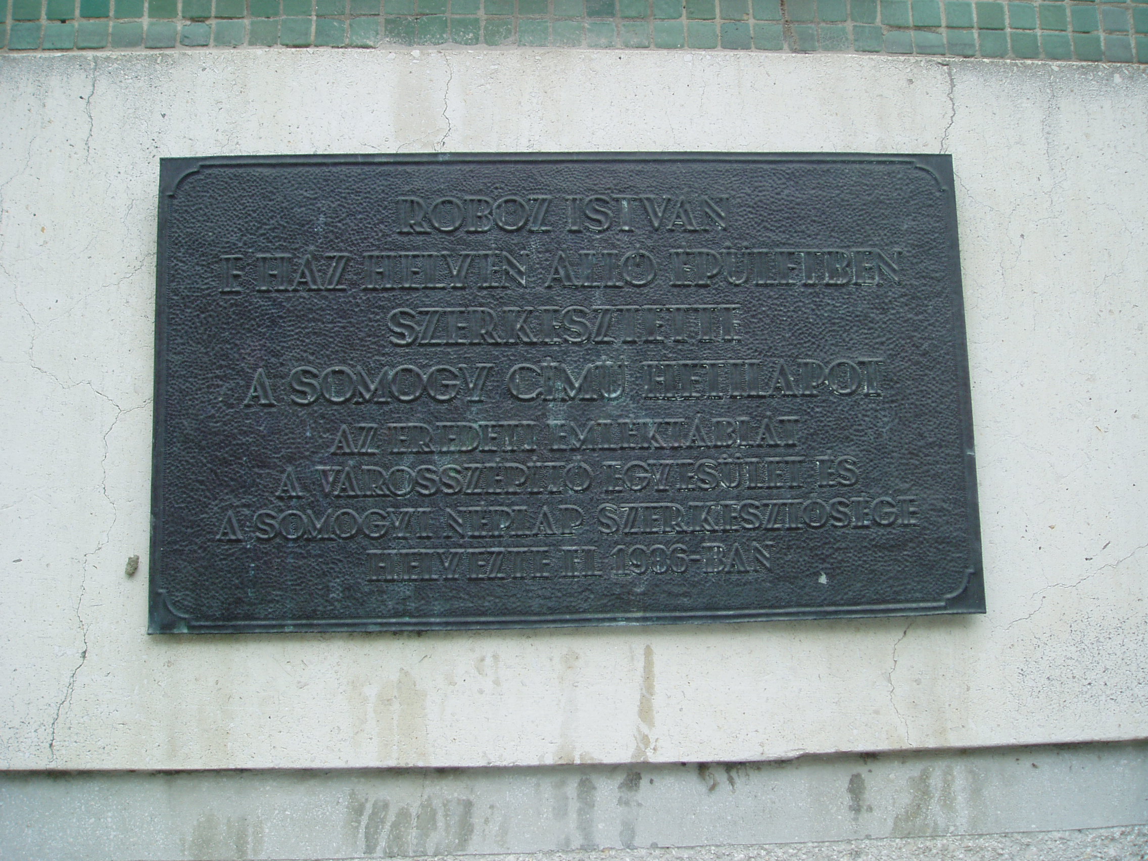 Nyilvános 964 | 1722 | Kaposvár, Dózsa utca 16. | A korábban ezen a helyen állott házban lakott 1892-től 1916-ban bekövetkezett haláláig Roboz István író, szerkesztő. Halála után az eredeti épületet emléktáblával jelölték meg, amelyet 1996-ban áthelyeztek az itt felépített új épületre, egy kiegészítő szöveges táblával együtt. Roboz István (Kötcse, 1828. okt. 26. - Kaposvár, 1916. ápr. 11.): költő, író, újságíró. Pápán Petőfi és Jókai iskolatársa volt. Diákéveit "Petőfi Sándor és az én pápai emlékeim" című, forrásértékű visszaemlékezéseiben örökítette meg. A szabadságharc alatt kormánybiztosi titkár Kaposvárott. Végleg 1856-ban telepedett le a városban, ahol először törvényszéki bíróként, később főjegyzőként dolgozott. Nagy aktivitással kapcsolódott be a dél-dunántúli irodalmi életbe. 1866-ban megalapította a Somogy című lapot, amelyet haláláig szerkesztett. Elnöke volt a Somogy vármegyei Berzsenyi Társaságnak. Ő írta - a hagyomány szerint az ádándi kastélyban - 1849-ben a később több nyelvre is lefordított "Kossuth imája a kápolnai csatában elesettek felett" című verset, amelyet a helyszínen felolvasott Wesselényi Miklósnak és Kemény Zsigmondnak. Az ima az 1850-es években a legismertebb hazafias fohász volt. A fénykép 2006 márciusában készült. Felh. irod.: Életrajzi lexikon www.adand.hu |