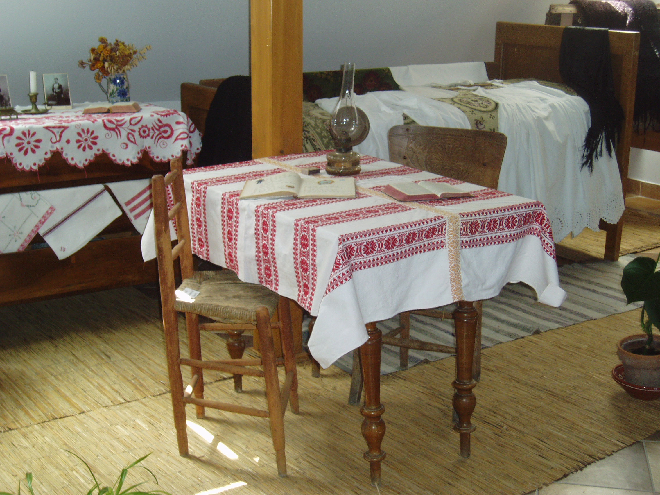 Nyilvános 929 | 1615 | Fonyód, Bartók Béla utca 3. Természetvédelmi és Helytörténeti Múzeum | A fonyódi Várhegyen kialakult Bélatelephez tartozó, a Balaton egyik legszebb panorámájú helyén álló villát az orvosi doktorátussal rendelkező, többek között Kelet-kutatóként is számon tartott lászlófalvi Velics Antal (1875-1915) építtette az 1900-as évek elején. Ebben a villában töltötte 1916 és 1917 nyarát Szinyei Merse Pál, hazánk egyik legkiválóbb festőművésze. Balatoni tartózkodása idején hozzávetőleg tíz fetményt alkotott. Az épület az 1980-as évek végéig moziként üzemelt. Felújítása után, 2004-ben nyílt meg termeiben a fonyódi Természetvédelmi és Helytörténeti Múzeum. Benne a Fonyód történetét és néprajzát bemutató állandó kiállítás mellett időszaki kiállításokat is rendeznek. A képen a néprajzi kiállításrész látható. A fénykép 2007 júliusában készült. Felh. irod.: http://muzeum.fonyod.hu/ |