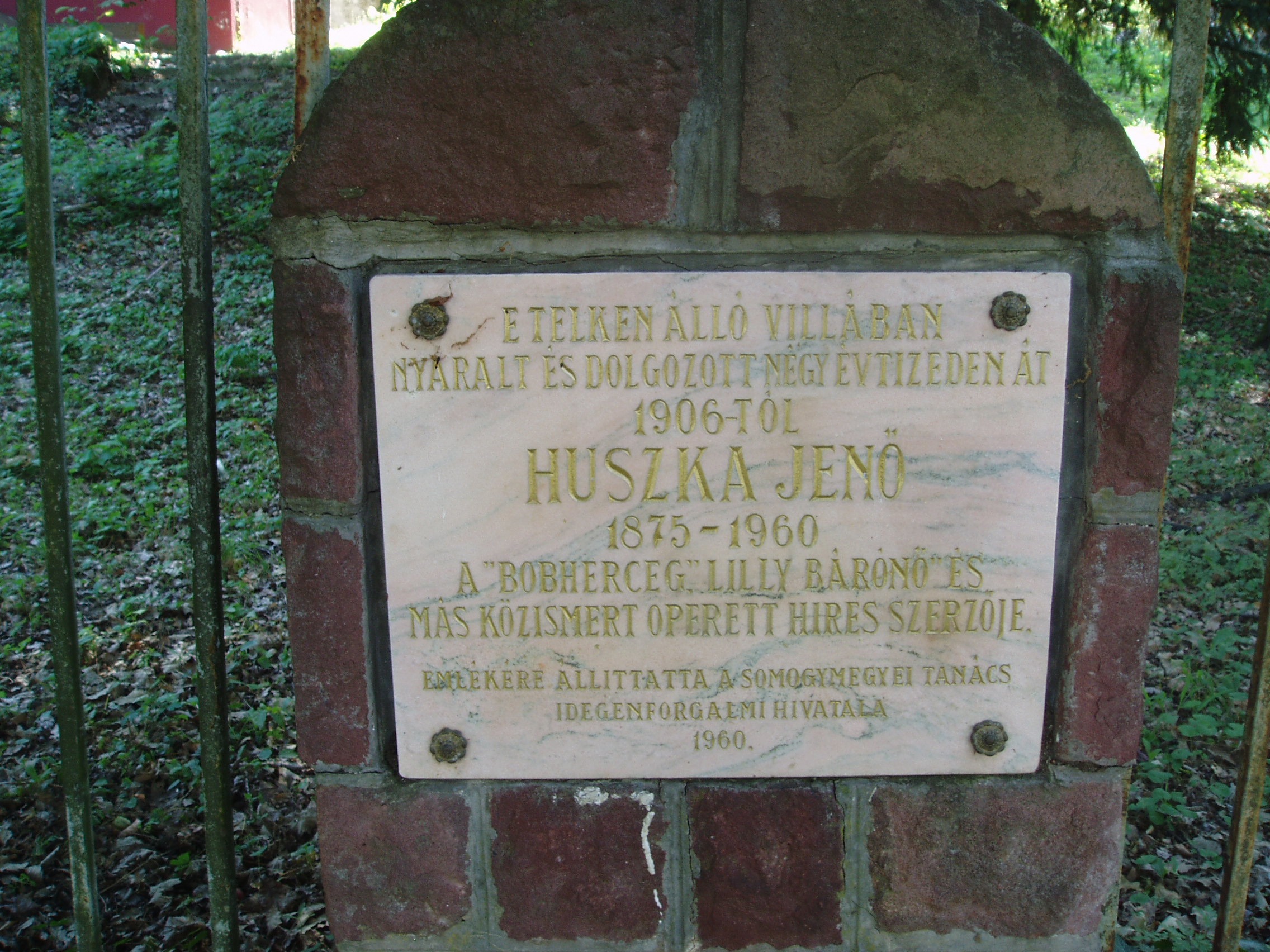 Nyilvános 880 | 1556 | Fonyód, Bartók utca 42. Huszka Jenő villája | A fonyódi magasparton húzódó villasor közepén találjuk Huszka Jenő egykori villáját, ahol csaknem négy évtizeden keresztül, 1907 és 1944 között pihent és alkotott. Huszka először az ettől a villától balra lévő ún. Náray–Szabó–villát vásárolta meg, majd 1906-ban elvette feleségül a mostani Huszka–villa akkori tulajdonosának, Lippich Eleknek a lányát, Leonát. Amikor a házaspár 1924-ben elvált, a zeneszerző megvásárolta a villát, így továbbra is itt töltötte a nyarakat második feleségével, Arányi Mária írónővel. Huszka ebben a villában írta a Lili bárónő több dalát, s itt komponálta a Mária főhadnagy csaknem teljes zenei anyagát. A villában használt íróasztala ma a közeli múzeum állandó kiállításán megtekinthető (lásd: Fonyód, Bartók u. 3.) Sajnos, a villa kerítésén 1960-ban elhelyezett emléktábla szövege meglehetősen pontatlan. A fénykép 2007 júliusában készült. Felh. irod.: Arányi Mária: Szellő szárnyán... Huszka Jenő életének regénye. Bp. Zeneműkiadó, 1977 htp://konyvtar.fonyod.hu/fek.htm |