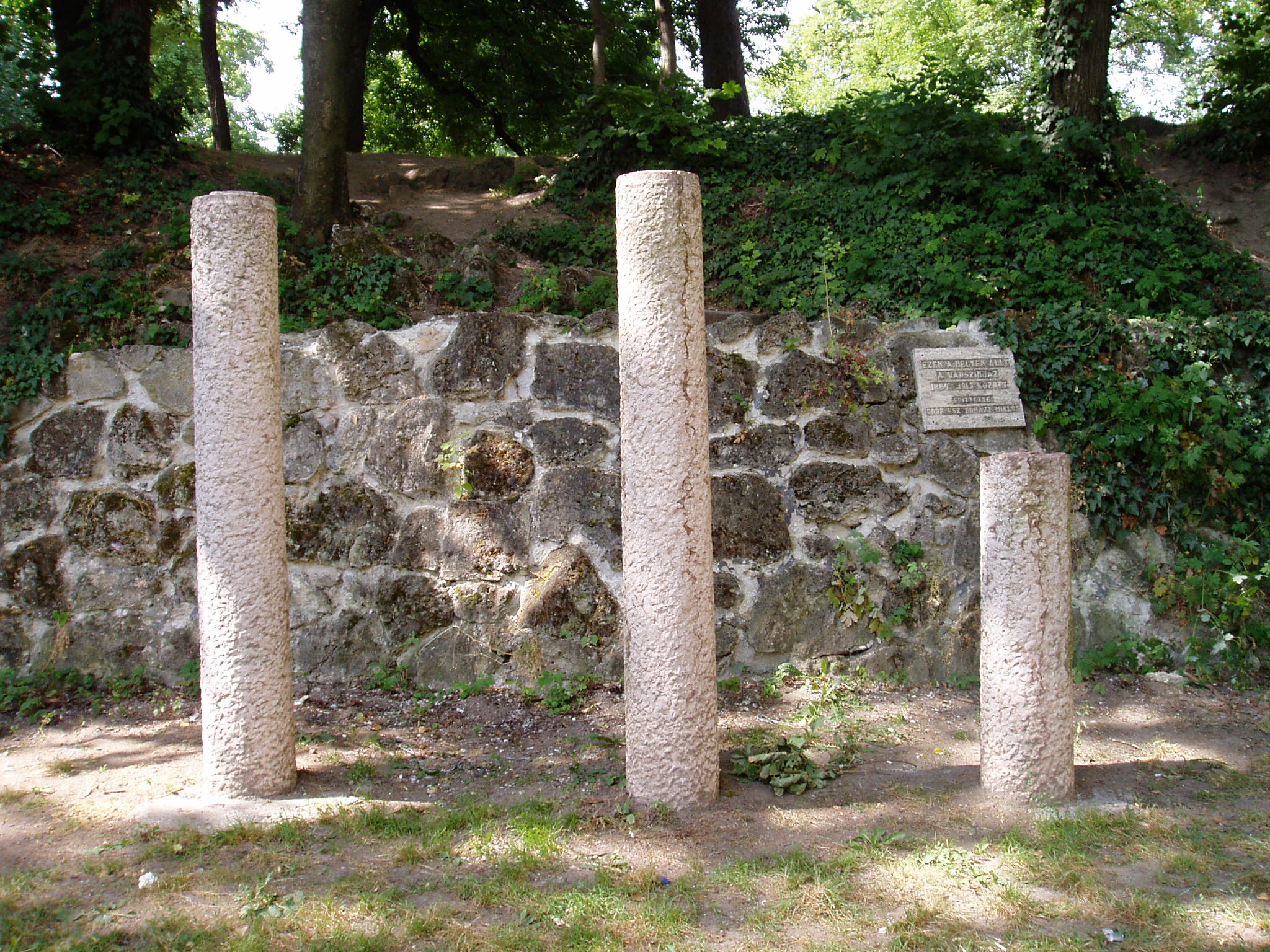 Nyilvános 1260 | 2869 | Tata, Kastély tér: a régi színház maradványai | A kastélyparkban, az Esterházy sétány nyugati oldalán, a támfal előtt három megmaradt oszlop és a falon emléktábla idézi az egykori Esterházy–kastélyszínházat. Esterházy Miklós József gróf (1839–1897) életét két nagy szenvedély kísérte: a lovassport és a művészetek iránti rajongás. Nagy vagyonából mindkét passziójára sokat költött. Tréningtelepet és versenypályát létesített, lóversenyeket rendezett. S hogy az összegyűlt főúri vendégeket kulturális élményekben is részesítse, 1888-ban létrehozta kastélyszínházát. A kis ékszerdoboz épületet a kor két neves színházépítője, Ferdinand Fellner és Hermann Helmer tervezte (az ő alkotásuk a budapesti Vígszínház is). A grófi Várszínház csak időszakosan, lóversenyszezonban játszott, méghozzá német nyelven. Műsorán kellemes korabeli vígjátékok, operettek, énekes játékok, olykor operarészletek szerepeltek. A gróf halála után megszűntek az előadások. A használaton kívüli épület állaga leromlott, s 1913-ban lebontották. Az itt felállított oszlopokon kívül az Öregvárban található Kuny Domokos Múzeumban néhány tárgyi emlék és kép idézi egykori életét. A fénykép 2005. júliusában készült. Felh. irod.: Polgárdy Géza: Tatatóváros és környéke kalauza. Az 1939-es kiadás reprintje. Tata, Móricz Zsigmond Városi Könyvtár, 1998 Staud Géza: Magyar kastélyszínházak 3. kötet. Bp. Színháztudományi Intézet - Országos színháztörténeti Múzeum, 1964 |