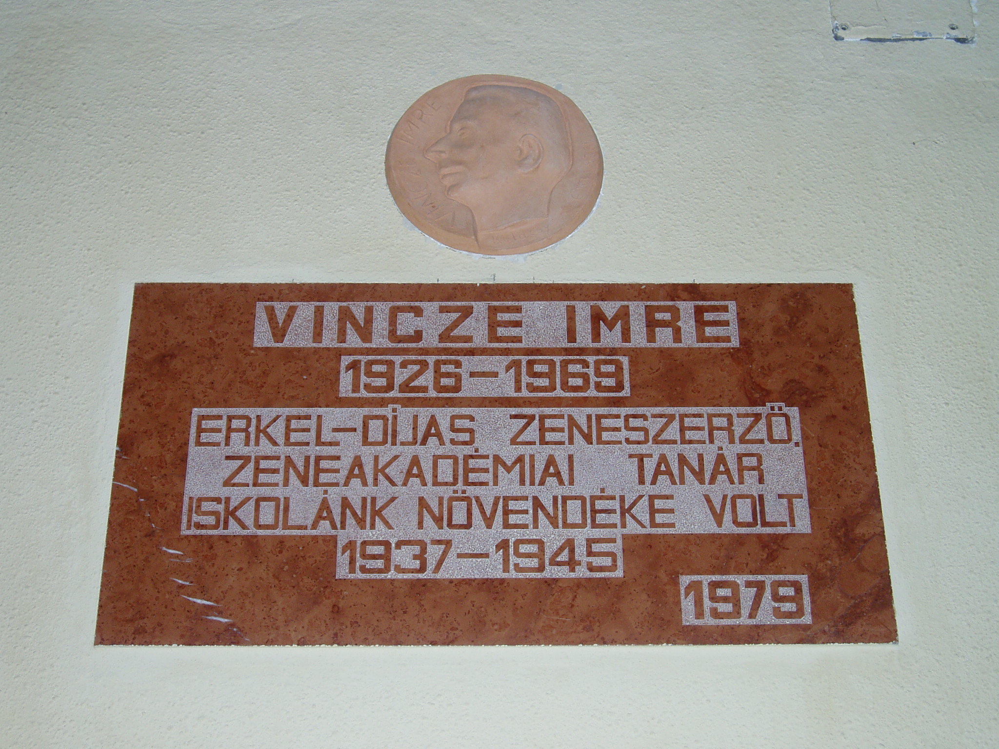 Nyilvános 1236 | 2701 | Tata, Tanoda tér 5. Eötvös József Gimnázium: Vincze Imre emléktáblája | A tatai gimnáziumot 1765-ben gróf Esterházy Miklós alapította, s vezetésére a piarista tanítórendet kérte fel. Az iskola kezdetben a közeli majki kamalduli szerzetesek többször is átalakított gazdasági épületeiben működött. A jelenlegi iskolaépületet a XX. század elején emelték, 1912-ben kezdődött meg benne a tanítás. Az első emeleti folyosó falán neves egykori tanárok és diákok emléktábláit helyezték el. Vincze Imre (1926-1969) zeneszerző 1937-1945 között volt az iskola diákja. A fénykép 2005. júliusában készült. Felh. irod.: www.eotvos-tata.sulinet.hu Wehner Tibor: Tatai szobrok, emlékművek, emléktáblák. Tata, 1980 |