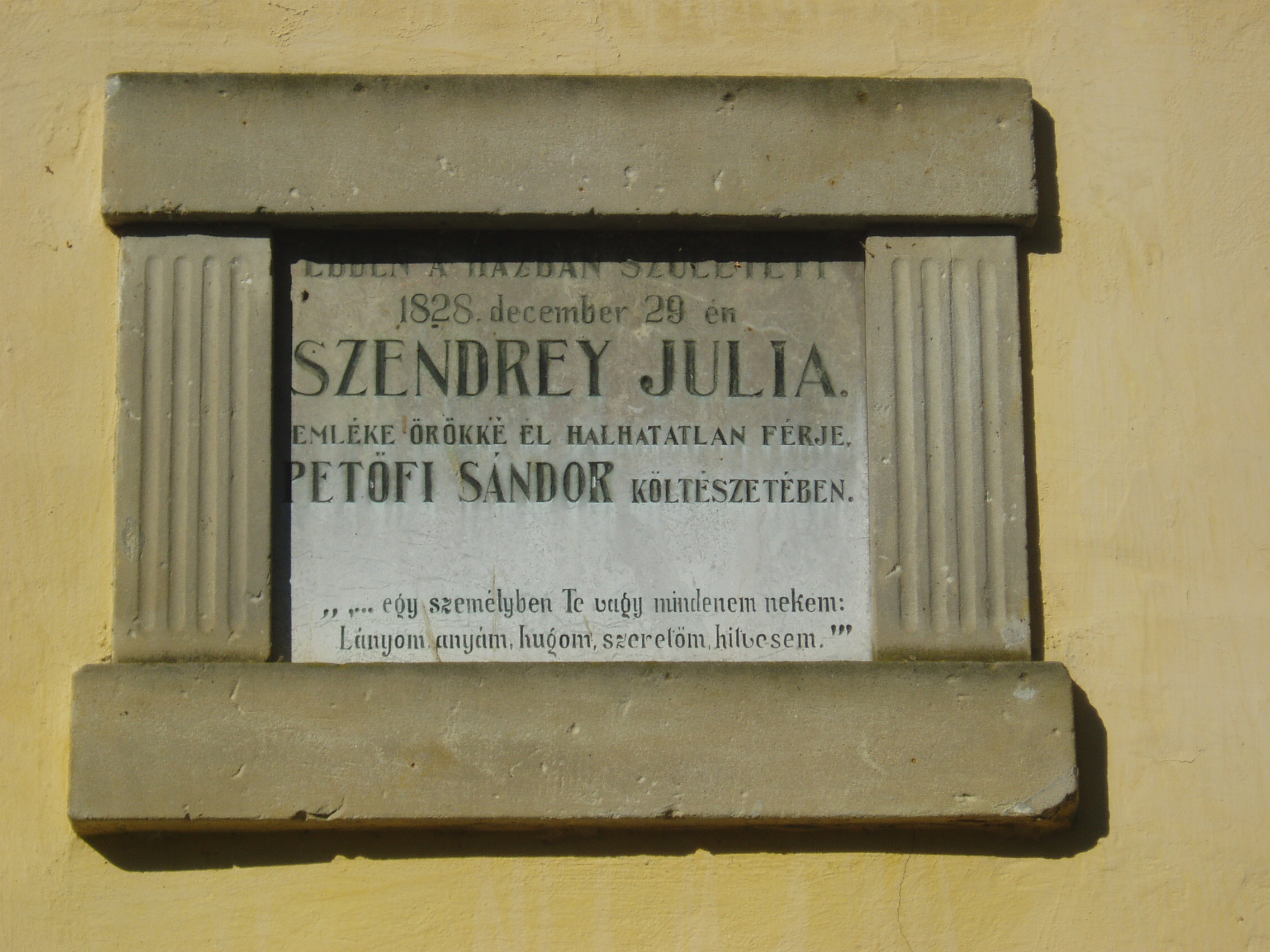 Nyilvános 1068 | 2420 | Keszthely, Szendrey telep: Szendrey Júlia szülőháza | A keszthelyi temetőtől délre, az egyetem új épületei között vezet az út Újmajorba, amelyet ma Szendrey telepnek hívnak. XVIII-XIX. századi házak állnak itt, amelyek egykor a Festetics uradalomhoz tartoztak. Az egyik épületen 1909-ben emléktáblát helyeztek el, ugyanis itt született 1828. december 29-én Szendrey Júlia. Apja, Szendrey Ignác ez időben a Festetics uradalom tiszttartója volt, de hamarosan elkerült innét a család Erdélybe. Szendrey Júlia 1846-ban ismerkedett meg Petőfivel, 1847-ben kötöttek házasságot. Kisfiuk, Zoltán a szabadságharc idején Debrecenben született (lásd: Hajdú-Bihar megye: Debrecen, Batthyány u. 16.). Férje halála után Júlia Horváth Árpád egyetemi tanár felesége lett. 1868. szeptember 6-án, 39 éves korában Pesten halt meg. Lapokban, folyóiratokban néhány költeménye, prózai írása és naplójának részletei jelentek meg. 1856-ban Magyarországon Andersen meséit először az ő fordításában olvashatták magyarul. Keszthelyen utca, iskola is viseli nevét. A Goldmark Károly Művelődési Ház előcsarnokában 1983-ban elhelyezték emléktábláját. Szendrey Júlia szülőházával szemben egy másik egykori intézői ház található, amelyen Bartók Béla emlékét idézi márványtábla, aki 1906-ban, egyik korai népdalgyűjtő útján szállt meg itt. A felvétel 2006 októberében készült. Felh. irod.: Látnivalók Zala megyében. Miskolc, Well PRess, 1999 Zalai életrajzi kislexikon. = http://zalai.dfmk.hu/zalaiak |