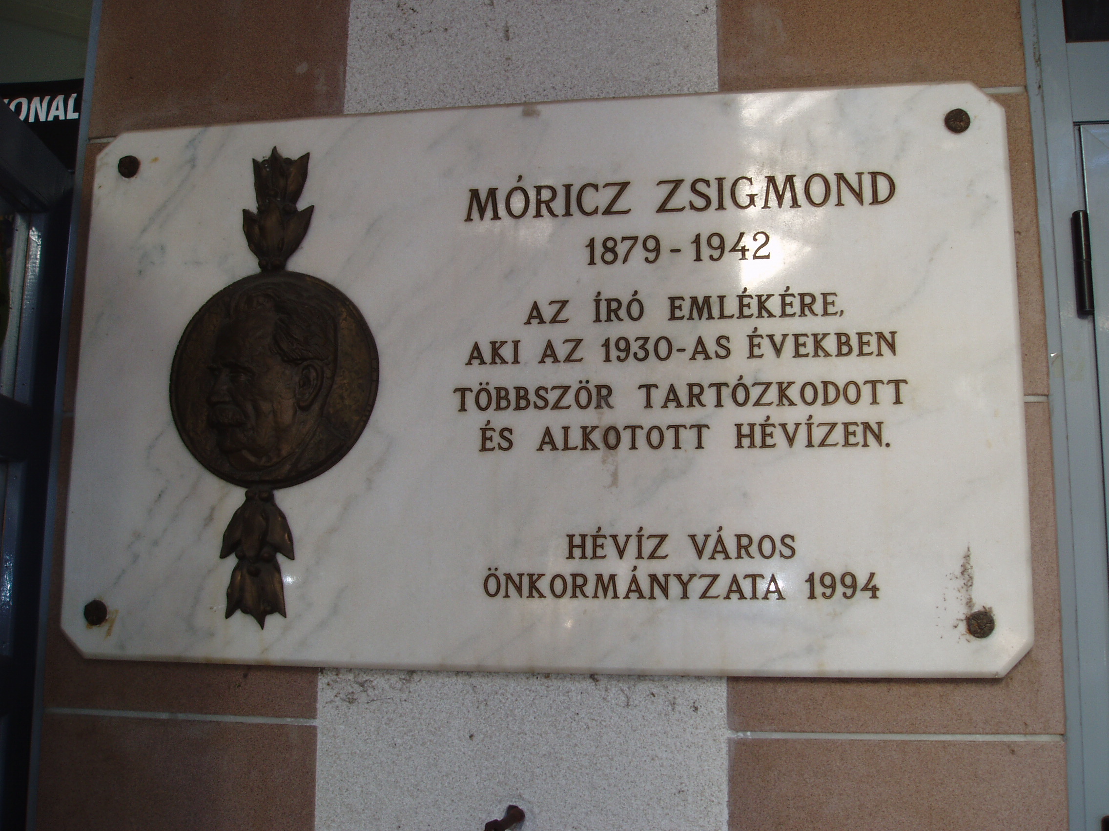 Nyilvános 1106 | 2423 | Hévíz, Schulhof sétány: Hévízi Panteon | A hévízi tó Európa legnagyobb melegvízű tava. Vize a radioaktív termálvizek közé tartozik, s különleges gyógytényező a tó fenekét több méter vastagságban borító iszap is. Gyógyhellyé Hévíz a XVIII. században vált. A XIX. század elején már messze földről látogatták. 1857-ben a Festetics-család birtokába került a település, ezután kezdődött fokozatos kiépülése. A magyar művészvilág tagjai sűrűn látogatták Hévízfürdőt gyógyulás és pihenés céljából. Nekik állít emléket a Szanatórium épületegyüttesének bejáratánál kialakított panteonfal. Itt helyezték el Móricz Zsigmond emléktábláját is, aki az 1930-as években többször tartózkodott és alkotott Hévízen. A felvétel 2006 októberében készült. Felh. irod.: Lárnivalók Zala megyében. Miskolc, Well PRess, 1999 |